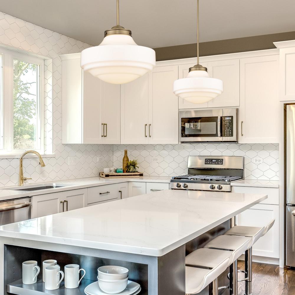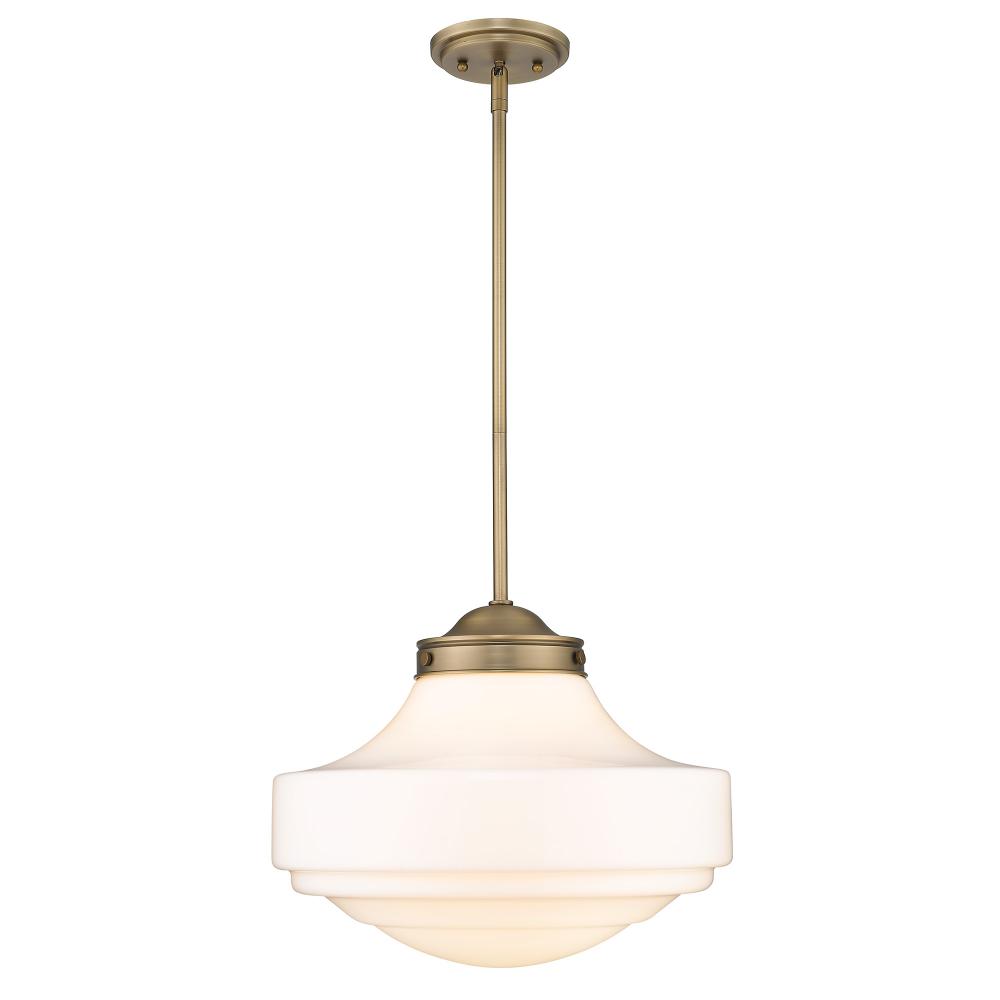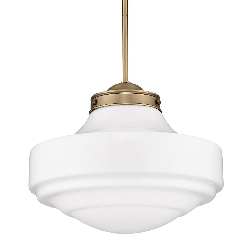 Bring farmhouse elegance into your home with the Golden Lighting Ingalls 1-light 16in Pendant. Featuring a glass shade and a modern brass frame, it creates a welcoming atmosphere. The Vintage Milk Glass shade features a dense, opaque milky white color that provides a soft, glare-free glow, reminiscent of authentic schoolhouse lighting. Our Modern Brass finish epitomizes understated elegance, offering a sophisticated muted hue and a fine brushed surface that beautifully diffuses light. This pendant is suitable for covered and semi-enclosed spaces like bathrooms and laundry rooms and is sloped-ceiling compatible with an adjustable height of 15.5" to 57.5". Overall dimensions are 16"W x 12.75"H x 16"D, requiring 1 E26 Medium base bulb (not included) with a max wattage of 100. Experience vintage charm and high-quality craftsmanship with this beautiful fixture.