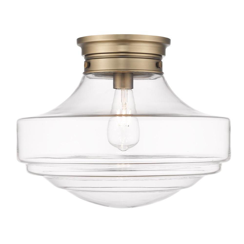Bring timeless elegance into your home with the Golden Lighting Ingalls 1-light 16in Semi-Flush Mount. Featuring a glass shade and a Modern Brass frame, it creates a welcoming atmosphere. This glass shade provides brilliant, unobstructed light, showcasing the fixture's design perfectly. The Clear Glass is polished to a high-gloss shine, allowing for maximum light dispersion. The Modern Brass finish embodies sophisticated elegance with its warm, muted hue, beautifully diffusing light to create ambient brilliance. Ideal for entryways, bedrooms, kitchens, and living areas with mid-height ceilings. Damp Location Rated: Suitable for covered and semi-enclosed spaces with occasional moisture, making it perfect for bathrooms and covered porches. Overall Dimensions: 16"W x 12.63"H x 16"D. Requires 1 E26 Medium base bulb (not included), with a maximum wattage of 100. Elevate your space with this exquisite blend of charm and quality, bringing artisan craftsmanship to your decor.
