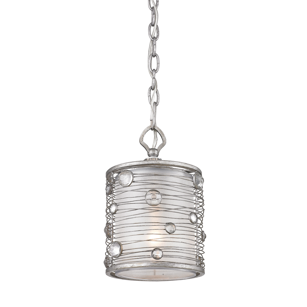 Bring Glam elegance into your home with the Golden Lighting Joia 1-light Pendant. Featuring a fabric shade and a Peruvian Silver frame, it creates a welcoming atmosphere. The Sterling Mist shade, characterized by a fine weave and metallic appearance, diffuses light with a soft glow, enhancing the chic ambiance of your space. The Peruvian Silver finish showcases a rustic texture and warm undertones, providing a timeless quality. Ideal for indoor spaces not subject to moisture, this pendant is sloped-ceiling compatible and adjustable in height (min: 12.5"- max: 84.5"). Overall dimensions are 7.25"W x 11"H x 7.25"D, requiring 1 E26 Medium base bulb (not included, max 60 wattage). Elevate your decor with the quality and sophistication of this exquisite lighting piece.