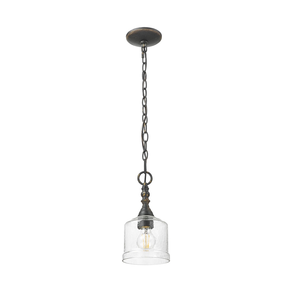 Bring rustic warmth into your home with the Golden Lighting Keating 1-light Pendant. Featuring a glass shade and an Antique Black Iron frame, it creates a compelling statement of style. This pendant features a Hammered Water Glass shade that provides a beautifully distorted and refractive light effect. The glass showcases a heavy, irregular texture that captures a dynamic glow, enhancing the pendant's rustic elegance. Perfect for kitchens, dining rooms, and entryways, this fixture is Dry Location Rated, making it suitable for indoor spaces. Installation is sloped ceiling compatible, with an adjustable height ranging from 15.25" to 88.75". It requires 1 E26 Medium base bulb (not included) with a maximum wattage of 100. Overall dimensions of 5.88"W x 11.75"H x 5.88"D ensure it adds a stylish touch without overwhelming the space. Embrace artisanal craftsmanship with this unique ceiling pendant that elevates your décor.