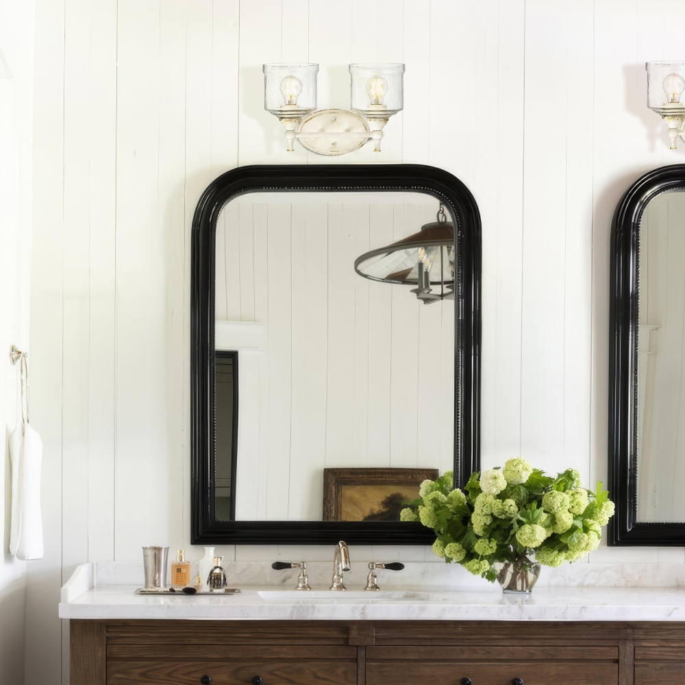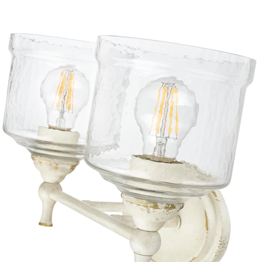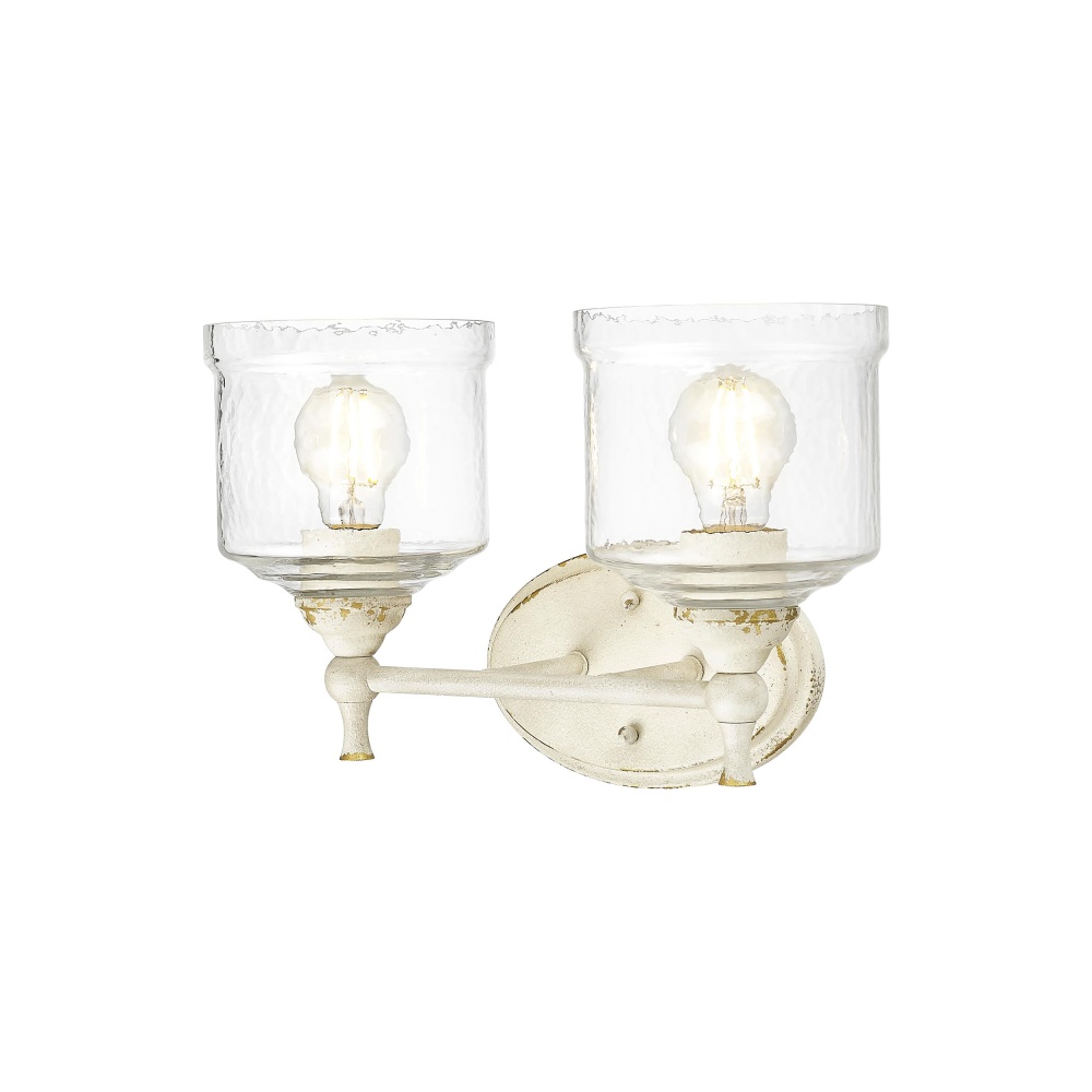 Transform your bathroom into a welcoming retreat with the Golden Lighting Keating 2-light Vanity. Featuring a glass shade and an antique ivory frame, it sets the tone for warmth and elegance. The glass shade showcases hammered water glass, designed to create a beautifully refractive light effect, enhancing the light’s warm glow in your space. Rich with character, the antique ivory finish evokes the timeless charm of classic design, artfully aged to reveal an exquisite, gilded underlayer beneath its textured surface. This vanity light is damp location rated, making it suitable for bathrooms and semienclosed areas with occasional moisture. It requires 2 E26 Medium base bulbs (not included), with a maximum wattage of 100 per bulb. Overall dimensions measure 15"W x 9.75"H x 7.5"D, contributing practical appeal to your home decor. Elevate your space with a blend of rustic charm and artisanal craftsmanship.