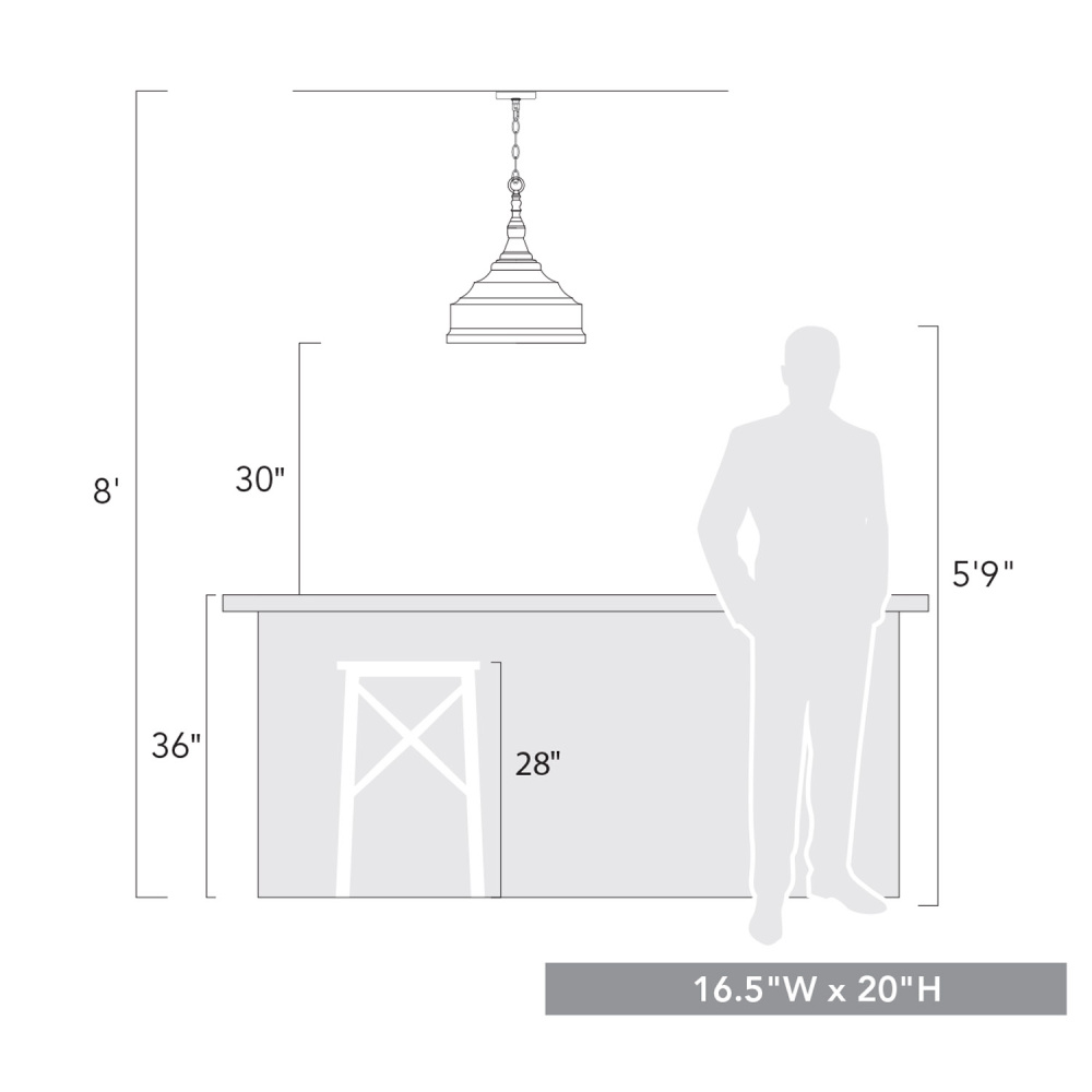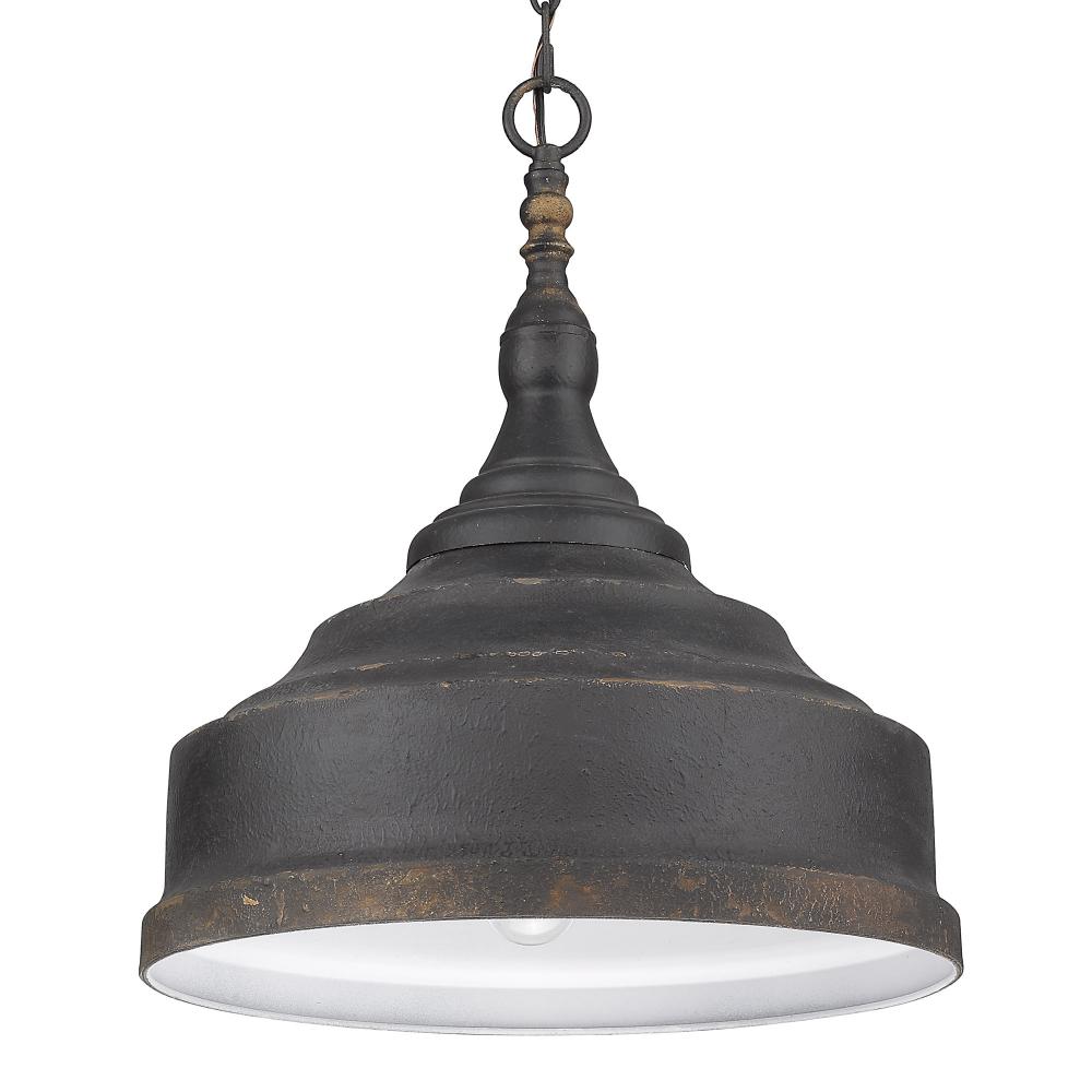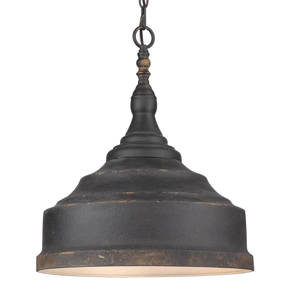 Embrace classic farmhouse style with the Golden Lighting Keating 3-light Pendant. Featuring a metal shade and an antique black iron frame, it creates a striking centerpiece in your space. The metal shade adds a rugged charm, perfectly complementing the dynamic and inviting illumination this pendant provides. Its robust design encapsulates a rustic allure while ensuring focused lighting for any gathering. This antique black iron finish showcases a deeply textured surface that reveals glimpses of an antiqued gold base beneath, enhancing the fixture’s handcrafted character. Ideal for industrial and rustic decors, it seamlessly fits into various settings and styles. Perfect for dining rooms, kitchens, and entryways, this damp location rated pendant is suitable for covered and semi-enclosed spaces with occasional moisture. Requires 3 E26 medium base bulbs (not included), max of 60 watts each. Overall dimensions are 16.5"W x 19.75"H x 16.5"D. This statement piece will transform your home with its cozy charm and quality artistry, inviting warmth into your interiors.