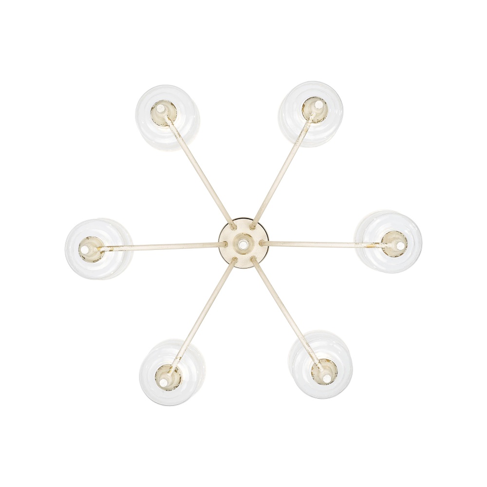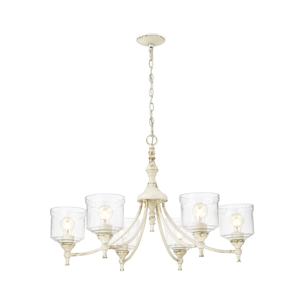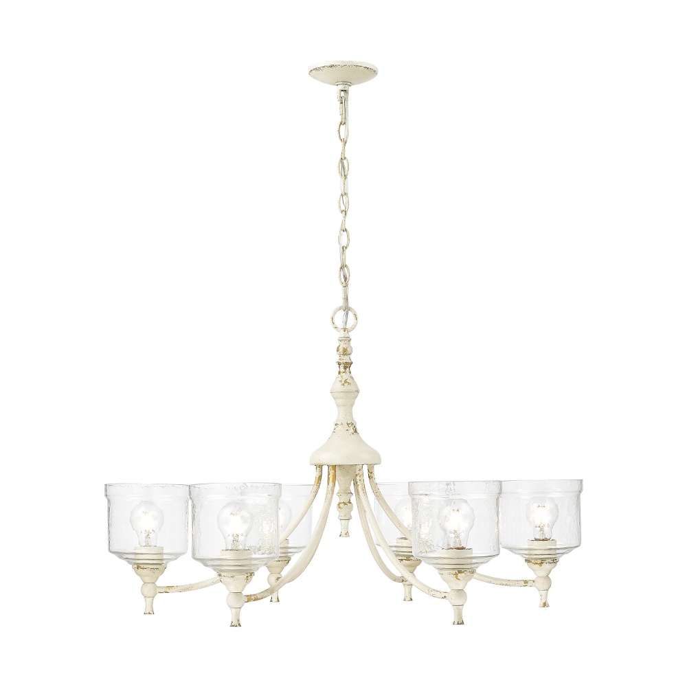 Bring a touch of rustic elegance into your home with the Golden Lighting Keating 6-light Chandelier. Featuring a glass shade and an exquisite Antique Ivory frame, it creates an inviting ambiance. The hammered water glass shade beautifully distorts and refracts light, casting intricate patterns and enhancing your home's atmosphere. Evoking the timeless charm of a treasured heirloom, the Antique Ivory finish is rich with character and history, showcasing purposeful chips and weathered details that reveal glimmers of a warm, gilded underlayer. This chandelier is perfect for making a grand impression in dining rooms and foyers or elevating bedrooms and living spaces. Dry Location Rated, it is designed for indoor settings not exposed to moisture and can be easily installed on sloped ceilings with an adjustable height of 24.625" to 98.25". Overall Dimensions: 33.5"W x 21.25"H x 33.5"D. Requires 6 E26 Medium base bulbs (not included), with a maximum wattage of 60 per bulb. Elevate your décor with this stunning, artisanal piece that celebrates the craftsmanship and quality of your home.