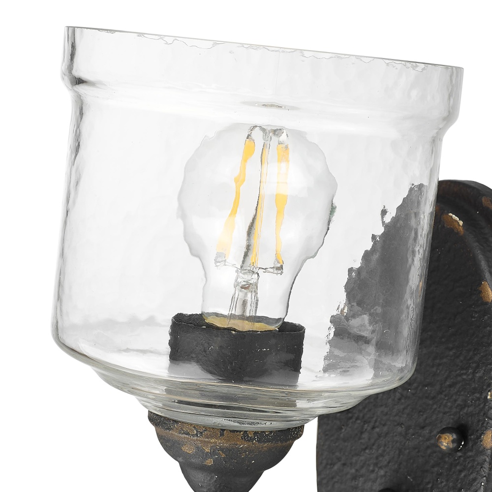 Bring rustic elegance into your home with the Golden Lighting Keating 9-light Chandelier. Featuring a glass shade and an Antique Black Iron frame, it creates a welcoming atmosphere. The chandelier showcases a stunning hammered water glass shade, which features an organic texture that beautifully refracts light. This artisanal choice adds a touch of dramatic elegance to any space, catching and reflecting light in captivating patterns. Capture the raw, authentic charm of the Antique Black Iron finish, a deeply textured surface that tells a story of time and endurance. This rugged finish is perfect for industrial, rustic, and farmhouse designs, making a powerful statement in any room. Ideal for dining rooms, foyers, or living spaces, this chandelier is rated for dry locations, ensuring safety indoors. It is also sloped-ceiling compatible and features an adjustable height, allowing for effortless customization in your space. Overall Dimensions: 44"W x 29.75"H x 44"D. Requires 9 E26 Medium base bulbs (not included), with a maximum wattage of 60 per bulb. Embrace the artisanal craftsmanship and timeless quality that this chandelier adds to your home, creating a cozy and inviting ambiance.