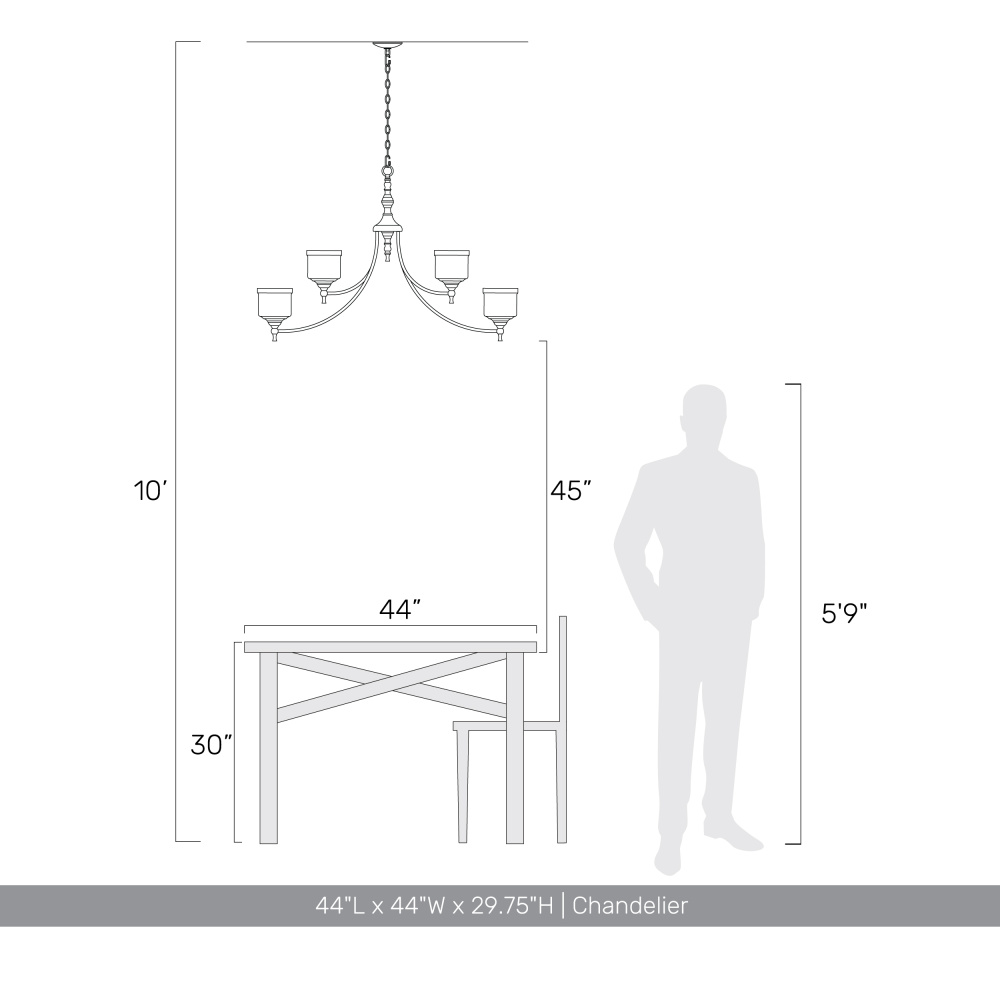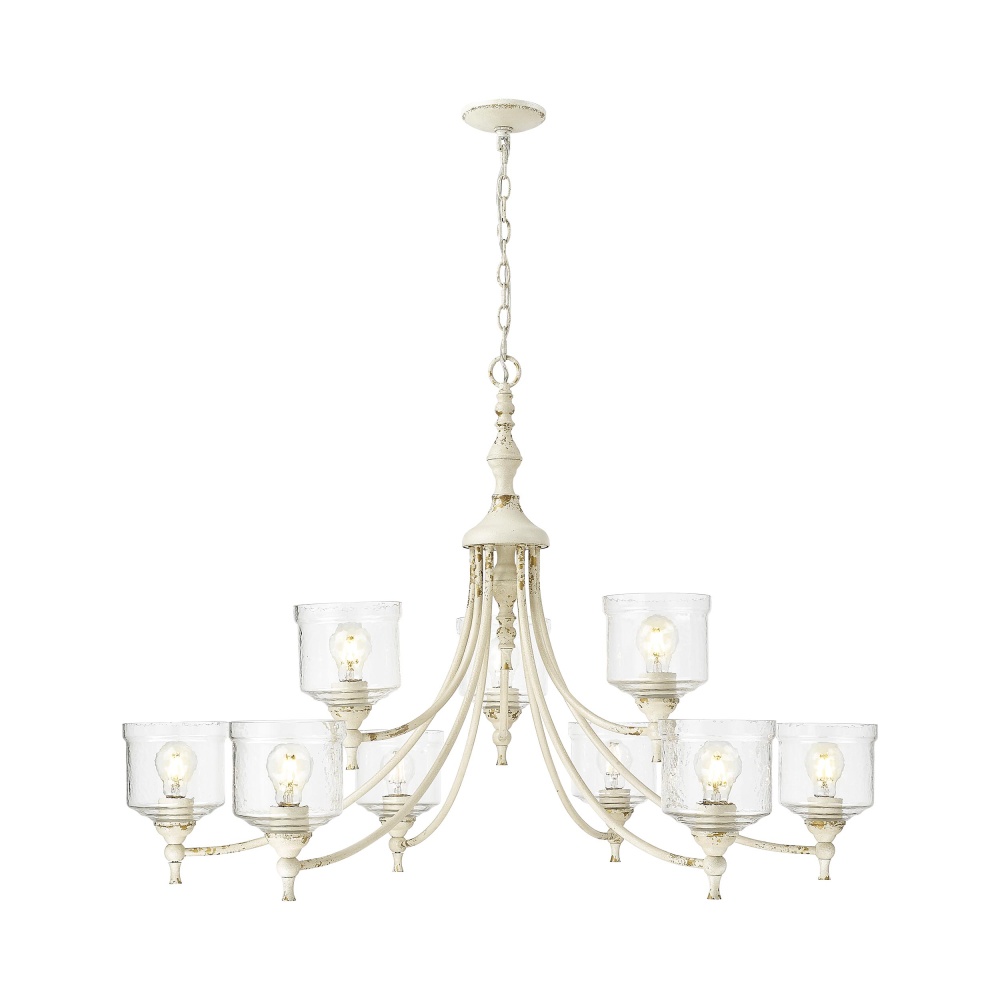 Bring farmhouse elegance into your home with the Golden Lighting Keating 9-light Chandelier. Featuring a glass shade and an antique ivory frame, it creates a welcoming atmosphere. The glass shade showcases hammered water glass, designed to create a beautifully distorted and refractive light effect that adds depth and texture to any space. Evoking the timeless charm of a treasured European heirloom, the antique ivory finish is artfully aged with a delicate craquelure texture, revealing glints of a warm, gilded underlayer. Ideal for indoor spaces such as dining rooms and living areas, this chandelier is dry location rated, ensuring safe ambiance in moisture-free settings. It’s sloped-ceiling compatible and features adjustable height from 33.125" to 106.625". Overall Dimensions: 44"W x 29.75"H x 44"D, Requires 9 E26 Medium base bulbs (not included), with a maximum wattage of 60 per bulb. Close your space with a touch of classic elegance and handcrafted artistry.