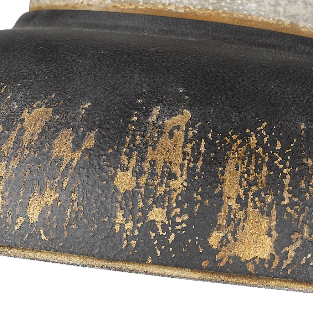 Bring farmhouse elegance into your home with the Golden Lighting Kinsley 2-light Flush Mount. Featuring a metal shade and an Aged Galvanized Steel frame, it creates a welcoming atmosphere. The metal shade features an Antique Black Iron finish, characterized by a matte, charcoal-black top coat over an antiqued gold base. This heavily distressed finish tells a story of authenticity, with its rough and pitted texture enhancing the warmth of light. The Aged Galvanized Steel finish masterfully recreates the complex patina of weathered metal, adding an industrial chic touch to your decor. Ideal for low ceilings in hallways, closets, laundry areas, and bathrooms, this flush mount is Damp Location Rated, suitable for covered and semi-enclosed spaces with occasional moisture. Requires 2 E26 Medium base bulbs (not included), max 100 watts. Overall dimensions are 14"W x 5.25"H x 14"D. With its artisanal quality and distinct character, the Kinsley fixture beautifully enhances any rustic or industrial design.