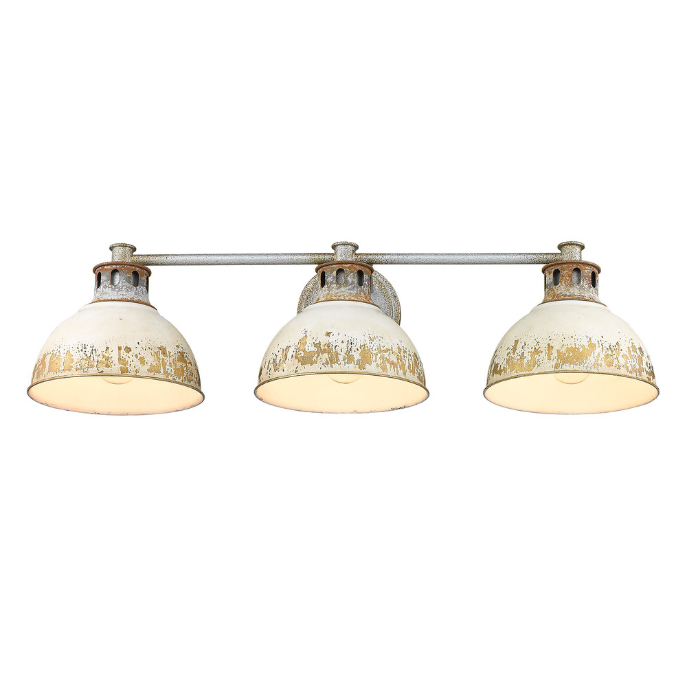 Step into timeless elegance with the Golden Lighting Kinsley 3-light Vanity in Antique Ivory shade. Featuring a metal shade and an Aged Galvanized Steel frame, it creates a welcoming atmosphere. The metal shade showcases a creamy ivory base with a delicate craquelure texture, combined with dark antiquing that highlights its stunning design, spreading a gentle illumination throughout the space. The Aged Galvanized Steel finish tells a captivating story of weathering and age, characterized by subtle imperfections that enhance its authentic charm. Perfect for bathrooms, this fixture is also Damp Location Rated, making it suitable for moisture-prone areas. Requires 3 E26 Medium base bulbs (not included), max 100 wattage each. With overall dimensions of 28.88"W x 7.88"H x 9.25"D, it is a perfect blend of style and functionality. Embrace sophistication in your home with this beautifully crafted lighting fixture that effortlessly enhances your design.