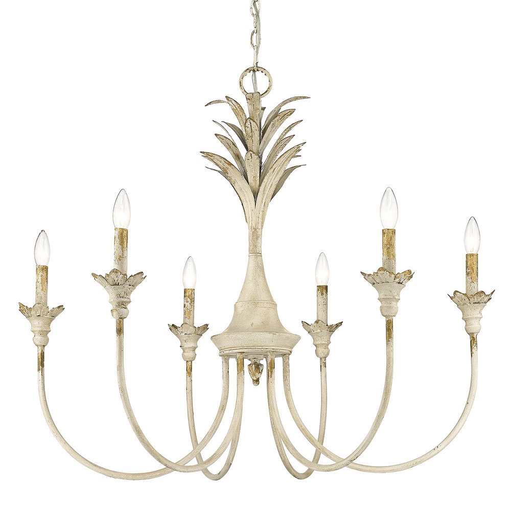 Bring nature-inspired elegance into your home with the Golden Lighting Lillianne 6-light Chandelier. Featuring an antique ivory finish, it creates a welcoming atmosphere. This chandelier features an exquisite design with no shade, allowing light to radiate freely, accentuating its floral and leaf motifs. Each piece is hand-painted with a unique finish that celebrates artisanal craftsmanship. The antique ivory finish offers a charming, rustic appearance that adds a romantic touch to your decor. Rated for dry locations, it is ideal for indoor spaces like dining rooms and living areas. The chandelier is sloped-ceiling compatible and features an adjustable height from 34.75" to 104.25", accommodating diverse ceiling types. It requires 6 E12 candelabra base bulbs (not included), each with a maximum of 60 watts. Overall Dimensions: 33.75"W x 31.25"H x 33.75"D. Elevate any space with this exquisite fixture that blends quality and style.
