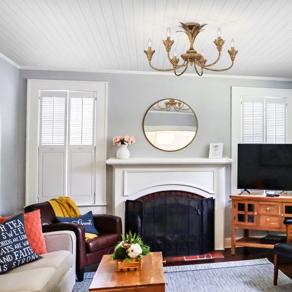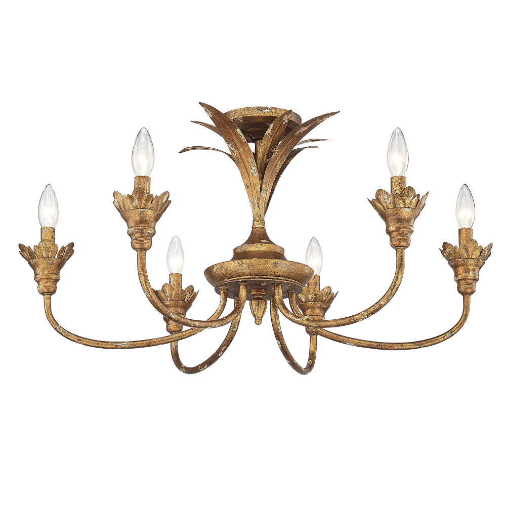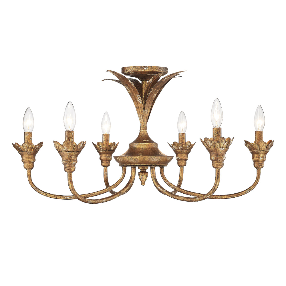 Bring Nature-Inspired elegance into your home with the Golden Lighting Lillianne 6-light Semi-Flush Mount. Featuring an Heirloom Gold finish, it creates a welcoming atmosphere. This semi-flush mount showcases intricate floral and leaf motifs, crafted in metal that highlights the beauty of craftsmanship. The Heirloom Gold finish conveys the warmth of a cherished family heirloom. Its textural, multi-layered design adds complexity and rustic charm, making it a unique centerpiece in any space. Perfect for entryways, bedrooms, kitchens, and living areas with mid-height ceilings, the fixture is Damp Location Rated, fitting for covered spaces with occasional moisture. It is easy to install and has dimensions of 28.5"W x 14.63"H x 28.5"D, requiring 6 E12 candelabra base bulbs (not included) with a maximum of 60 watts per bulb. Elevate your living space with the charming elegance of this artisanal design, sure to draw compliments and warmth into your home.