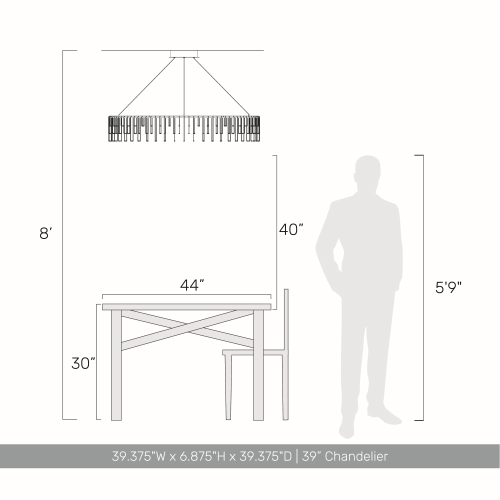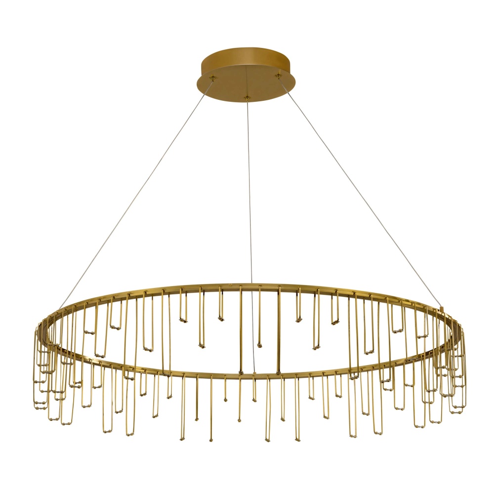 Bring modern elegance into your home with the Golden Lighting Lucerna Integrated LED 39in Chandelier. Featuring a stunning design and a Stainless Steel Gold frame, it creates a welcoming atmosphere. Crafted from stainless steel, this fixture showcases a clean geometric ring that dissolves into a shimmering fringe of delicate prongs, producing a dramatic, sculptural effect. The sophisticated finish ensures unmatched durability and corrosion resistance, making this chandelier a lasting addition to your space. Ideal for dining rooms and foyers, this Dry Location Rated light fixture is perfect for indoor spaces not exposed to moisture. Its adjustable height feature allows for customization, fitting beautifully on angled ceilings with a minimal height of 9.375" and a maximum of 129.375". Overall Dimensions: 39.38"W x 6.88"H x 39.38"D Integrated LED Technology provides brilliant, energy-efficient illumination with a dimmable light source offering 3110 rated lumens at a 3000K CCT for a warm glow. Elevate your home with this stylish chandelier, designed to impress while ensuring quality and durability.