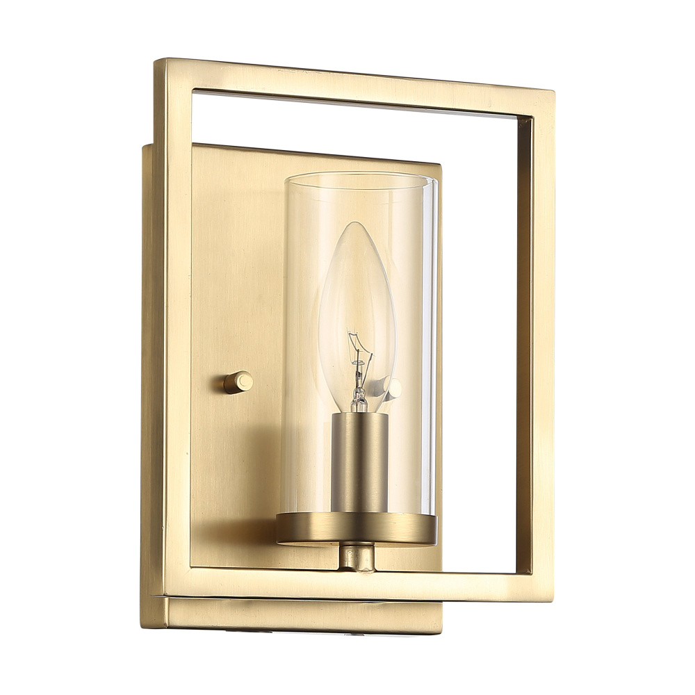 Bring architectural elegance into your home with the Golden Lighting Marco 1-light Wall Sconce. Featuring a glass shade and a Brushed Champagne Brass frame, it creates a welcoming atmosphere. The clear glass shade offers brilliant, unobstructed light, beautifully showing off the bulb's design. The epitome of modern sophistication, the Brushed Champagne Brass finish blends warmth with elegance, providing a touch of contemporary style perfect for any decor. Designed for damp locations, this sconce is ideal for bathrooms, covered patios, and laundry rooms. Requires 1 E12 candelabra base bulb (not included), max 60 watts. Overall dimensions: 7"W x 8.5"H x 3.38"D. Upgrade your space with the Golden Lighting quality and style you deserve.