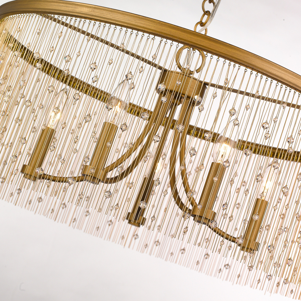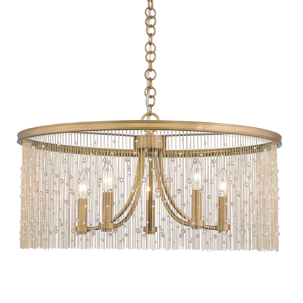 Bring Glam elegance into your home with the Golden Lighting Marilyn 5-light Chandelier in Peruvian Gold. This chandelier stands out with its exquisite design, offering a stunning focal point for any space. Featuring a striking design, this chandelier makes a statement with its shimmering fringe of delicate, beaded chains, creating a luxurious curtain of light that sparkles and shines with every movement. Inspired by the soft lustre of ancient treasures, the Peruvian Gold finish has a rich, muted gold with warm beige undertones, artfully hand-brushed to enhance a subtle, rustic texture and rich patina. This dry location rated fixture is ideal for indoor spaces not subject to moisture, perfect for dining rooms, living rooms, or foyers. The convertible design allows installation as a semi-flush mount or pendant, with an adjustable height from 15.5" to 85.625". With overall dimensions of 25"W x 12.63"H x 25"D, it requires 5 E12 Candelabra base bulbs (not included, max 60 watts per bulb). Elevate your home with this exquisite chandelier, where artisanal craftsmanship meets timeless appeal for sophisticated living.