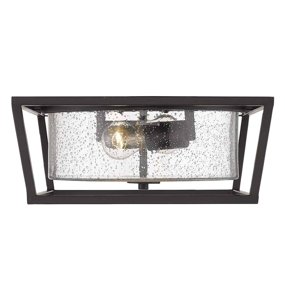 Bring stylish illumination into your space with the Golden Lighting Mercer 2-light Flush Mount in Matte Black. Featuring a glass shade and a matte black frame, it creates a warm and inviting atmosphere. The seeded glass shade features tiny air bubbles, giving a vintage appeal that beautifully diffuses light, creating an inviting ambiance. With a matte black finish that is both timeless and versatile, this fixture suits various decor styles. Ideal for low ceilings in hallways, bathrooms, or closets, it is damp location rated for spaces with occasional moisture. The overall dimensions are 14.5"W x 6"H x 14.5"D, requiring 2 E26 medium base bulbs (not included), with a maximum wattage of 60 per bulb. Elevate your home with this chic flush mount that blends functionality with aesthetic appeal.