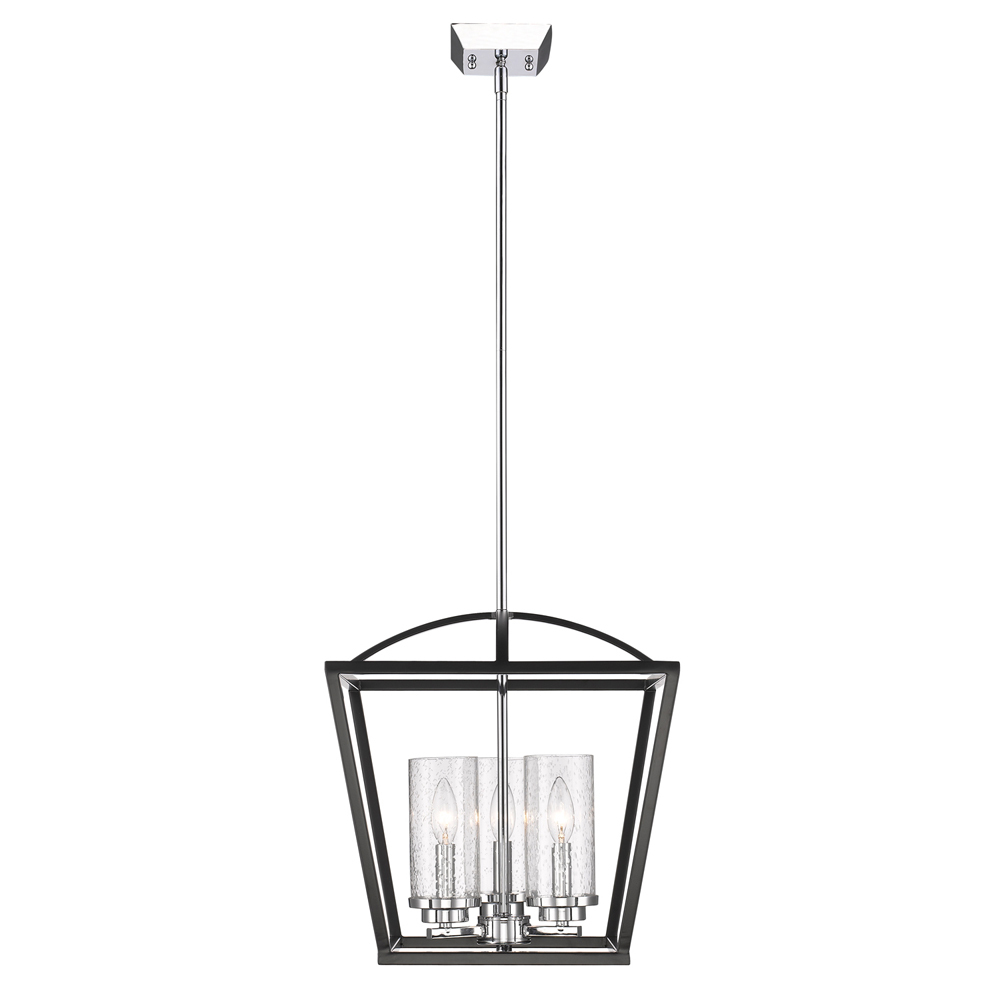 Bring transitional elegance into your home with the Golden Lighting Mercer 3-light Pendant in Matte Black and Chrome Accents. Featuring a glass shade and a matte black frame complemented by chrome details, it creates a welcoming atmosphere. The seeded glass shade, with its unique air bubbles, adds vintage charm while beautifully diffusing light across your spaces. The matte black finish is timeless and versatile, allowing it to blend seamlessly with various decor styles. Ideal for dry locations like bedrooms, living rooms, and hallways, this pendant is easily installed on sloped ceilings with an adjustable height from 18.5" to 60.5". Overall dimensions of 15"W x 15.5"H x 15"D and requires three E12 candelabra base bulbs (60W max) for illumination. Experience a stylish transformation in your space with this exquisite fixture.