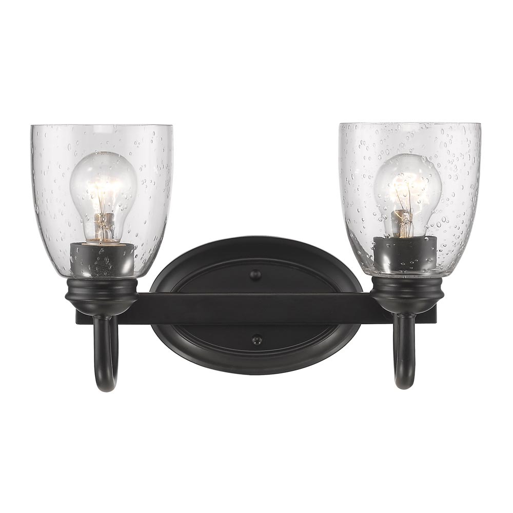 Bring modern elegance into your home with the Golden Lighting Parrish 2-light Vanity in Matte Black. Featuring a glass shade and a matte black frame, it creates a welcoming atmosphere. This glass shade features textured seeded glass, characterized by small, infused air bubbles that create a distinctive, antique-inspired texture. When illuminated, the 'seeds' catch the light, adding a brilliant sparkle and gently diffusing the bulb's glow for a warm, inviting ambiance. The matte black finish is smooth to the touch and provides a timeless look that complements virtually any decor, from minimalist and industrial to bold and contemporary. Brighten up bathrooms with dedicated lighting that flatters while providing practical task illumination. Damp location rated, it is suitable for covered and semi-enclosed spaces with occasional moisture, like bathrooms and laundry rooms. Overall Dimensions: 13.88"W x 8.5"H x 7.5"D. Requires 2 E26 Medium base bulbs (not included), max 60 wattage per bulb. Elevate your bathroom decor with this stylish yet functional vanity light, embodying quality and modern design.
