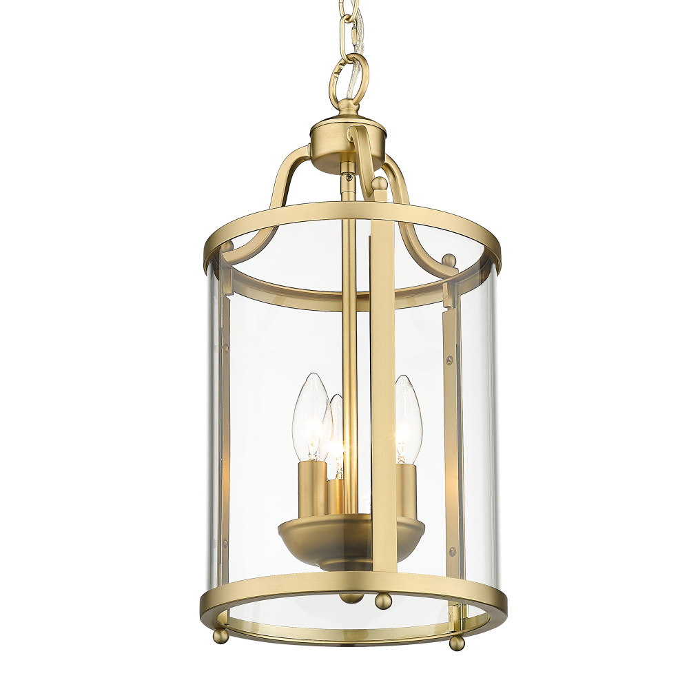 Bring modern sophistication into your home with the Golden Lighting Payton 3-light Pendant. Featuring clear glass shades and a Brushed Champagne Brass finish, it creates a stunning focal point. The transparent glass shades offer unobstructed light, highlighting the beauty of the bulbs within while providing a timeless aesthetic. Our Brushed Champagne Brass finish combines the warmth of brass with a soft silver hue, creating a chic and versatile color that enhances any interior design. Perfect for kitchens, dining rooms, or entryways, this fixture is Dry Location Rated, ideal for indoor spaces not subject to moisture. It requires 3 E12 Candelabra base bulbs (not included) with a max wattage of 60. Overall dimensions are 9"W x 19"H x 9"D. Illuminate your home with elegance and quality with this beautiful piece from Golden Lighting.
