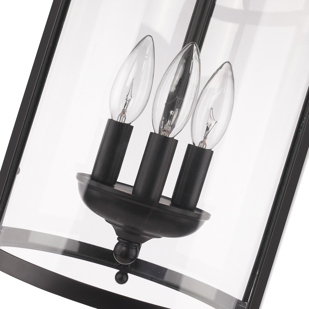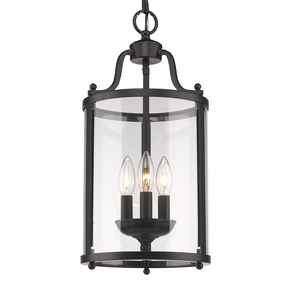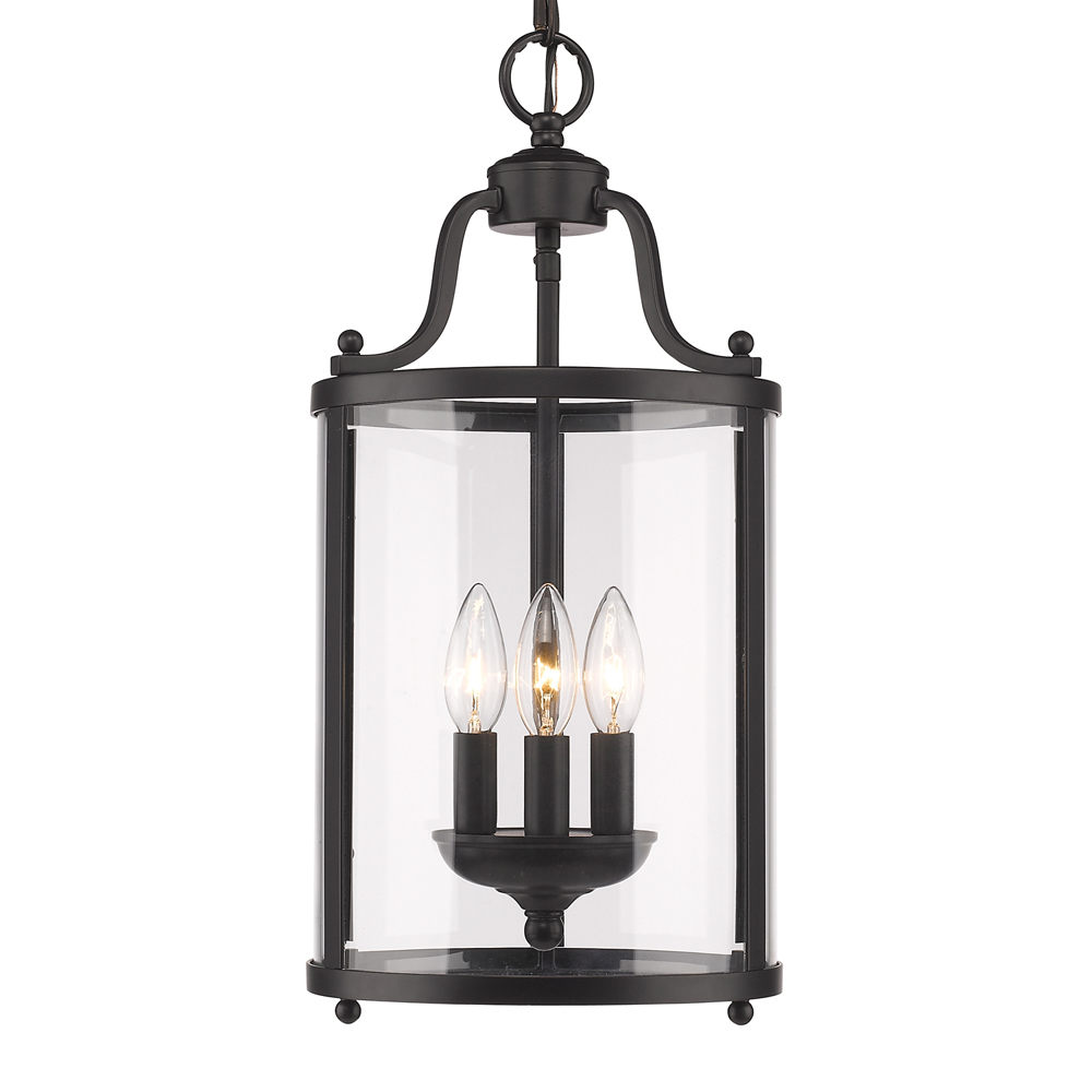 Bring modern elegance into your home with the Golden Lighting Payton 3-light Pendant. Featuring a glass shade and a Matte Black frame, it creates a welcoming atmosphere. The clear glass shade offers brilliant, unobstructed light, enhancing the beauty of the bulb while providing a touch of sophistication to your decor. The Matte Black finish is timeless and versatile, perfectly smooth to the touch, making it an ideal foundational choice for any style. This fixture is perfect for rooms such as kitchens, dining rooms, and entryways, and is rated for dry locations, ideal for indoor spaces not subject to moisture. Installation is simple with its sloped-ceiling compatibility and adjustable height (22" to 94"), allowing you to customize the ambiance of your space. Dimensions are 9"W x 19"H x 9"D, and it requires 3 E12 candelabra base bulbs (not included) with a maximum wattage of 60 per bulb. Enhance your home's lighting with this stylish and versatile pendant fixture, ideal for any modern or traditional setting.