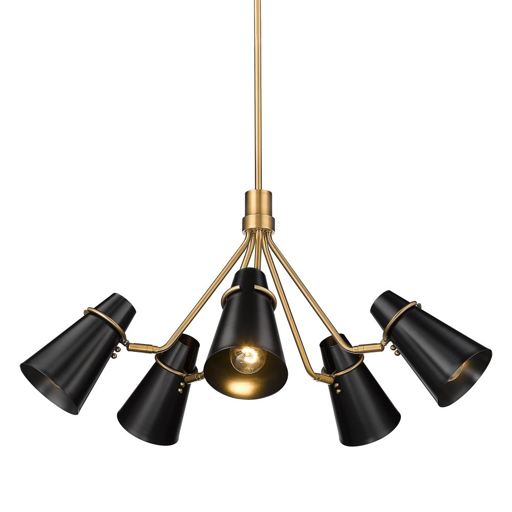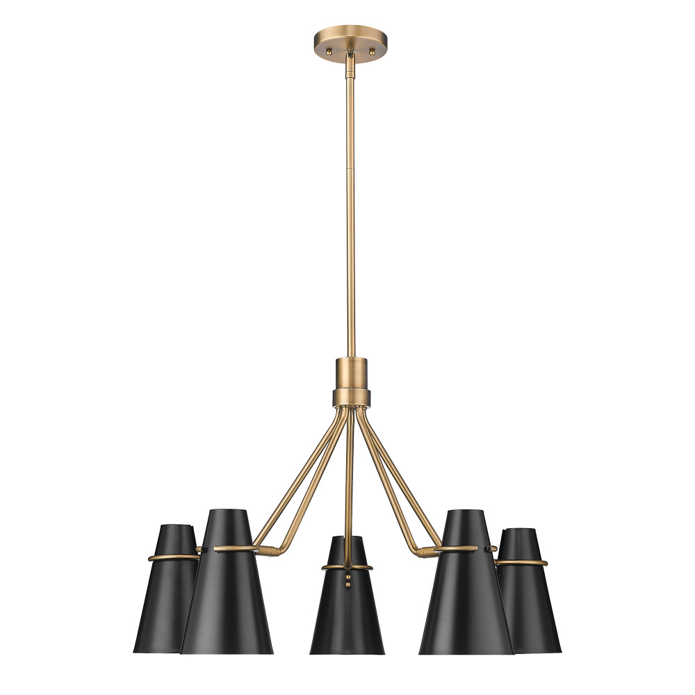 Bring timeless elegance into your home with the Golden Lighting Reeva 5-light Chandelier. Featuring a metal shade and a Modern Brass frame, it creates a welcoming atmosphere. The metal shade, finished in Matte Black, boasts a non-reflective matte sheen that absorbs light, providing a soft and sophisticated visual. Our Modern Brass finish is the epitome of understated elegance, with a rich patina that complements both modern and traditional interiors. Ideal for dry location settings, it fits perfectly in bedrooms, living rooms, and hallways. Installation is a breeze with sloped-ceiling compatibility, and you can customize the height from 21.5" to 63.5". With overall dimensions of 27.38"W x 18.38"H x 27.38"D, it requires 5 E26 Medium base bulbs (not included) with a maximum wattage of 100 per bulb. The Golden Lighting Reeva chandelier is not just an illumination source, it's a stylish statement piece that adds character to your home.