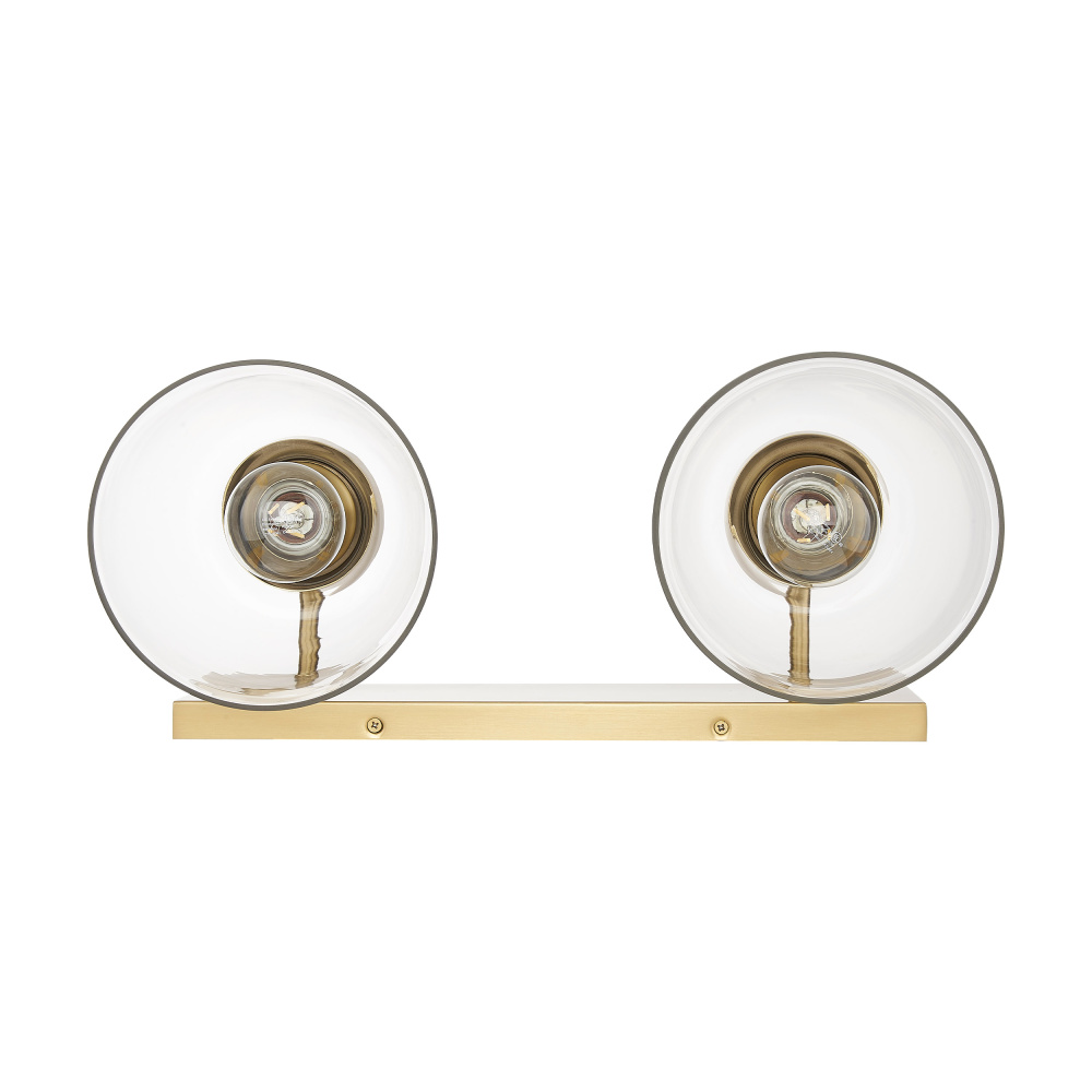 Bring a touch of modern sophistication into your bathroom with the Golden Lighting Remy 2-light Vanity in Brushed Champagne Brass. Featuring a glass shade and a chic Brushed Champagne Brass frame, this vanity light creates a warm and inviting atmosphere. The clear glass shade provides brilliant, unobstructed light, ensuring practical task illumination while enhancing the beauty of the bulbs. This finish offers an understated elegance, combining the warmth of brass with the softness of silver, adding a refined touch to any space. Ideal for brightening bathrooms, the fixture is Damp Location Rated, perfect for areas with occasional moisture. Requires 2 E26 Medium base bulbs (not included), max 60 wattage per bulb. Overall dimensions of 16.88"W x 8.75"H x 8"D ensure that this fixture fits seamlessly into your decor. Experience the perfect blend of function and style with the Golden Lighting Remy 2-light Vanity, designed to elevate any bathroom with contemporary flair.