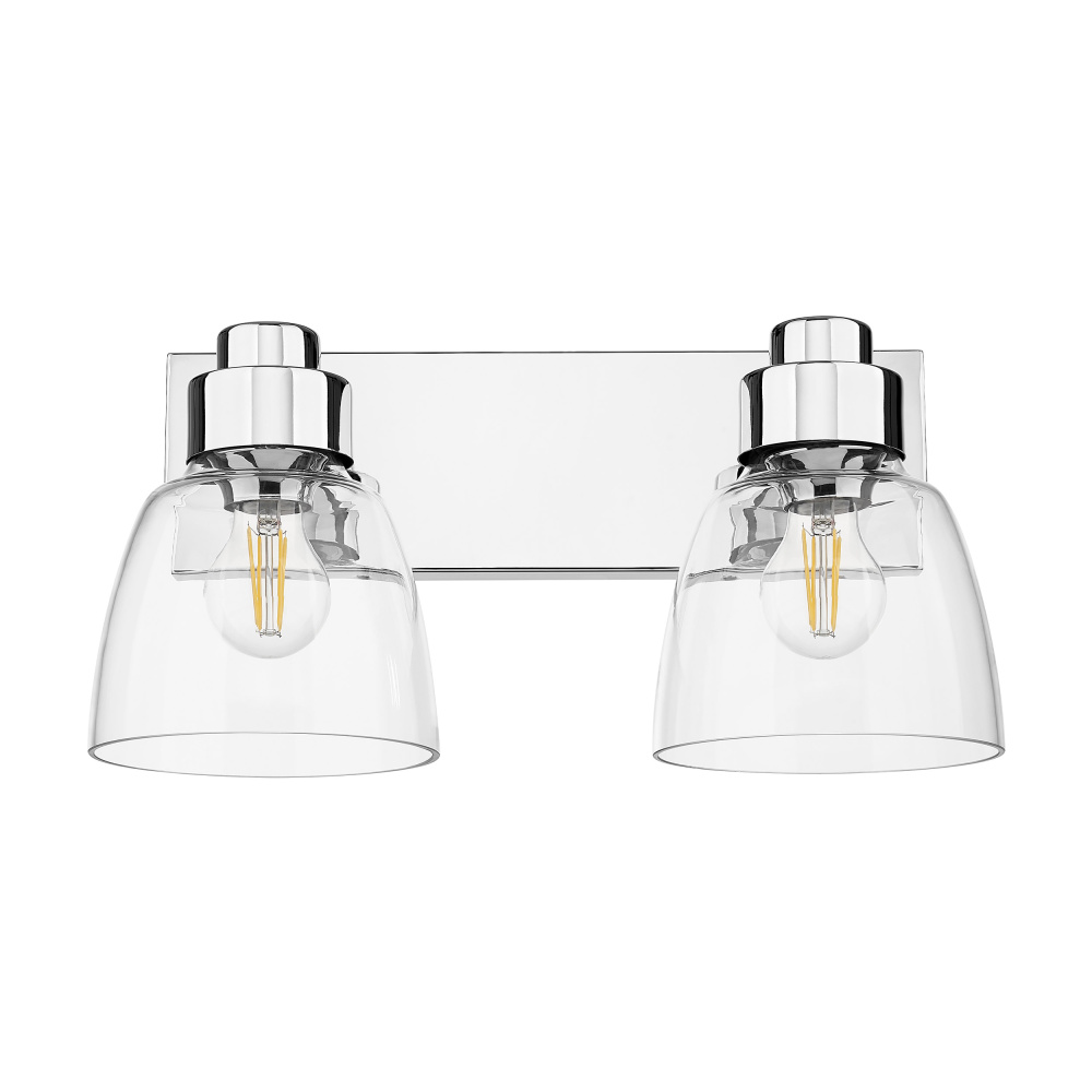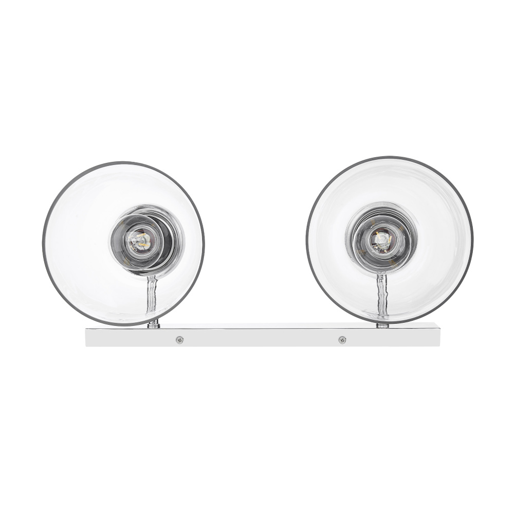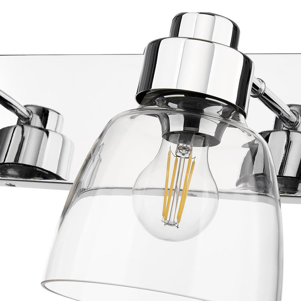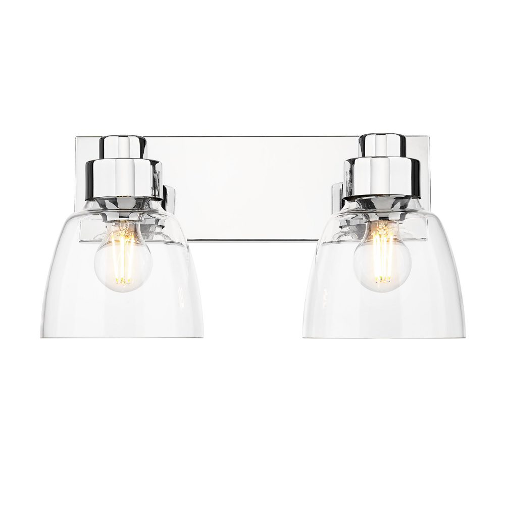 Bring timeless elegance into your home with the Golden Lighting Remy 2-light Vanity in Chrome. Featuring a glass shade and a chrome frame, it creates a welcoming atmosphere. The clear glass shade offers brilliant, unobstructed light, allowing the beauty of the bulb and fixture's design to take center stage. With its smooth, polished, and glossy finish, the shade complements a wide array of styles, from modern farmhouse to contemporary. The brilliant and timeless chrome finish provides a crisp, clean look that enhances any space. Its highly reflective surface adds a touch of brightness and sophistication, making it an adaptable choice for diverse decor. This fixture is damp location rated, making it suitable for bathrooms and covered porches. It requires 2 E26 Medium base bulbs (not included) with a maximum wattage of 60 per bulb. Overall dimensions measure 16.88"W x 8.75"H x 8"D. Elevate your home with this versatile lighting option that combines style and quality in one fixture.