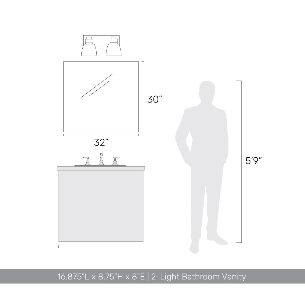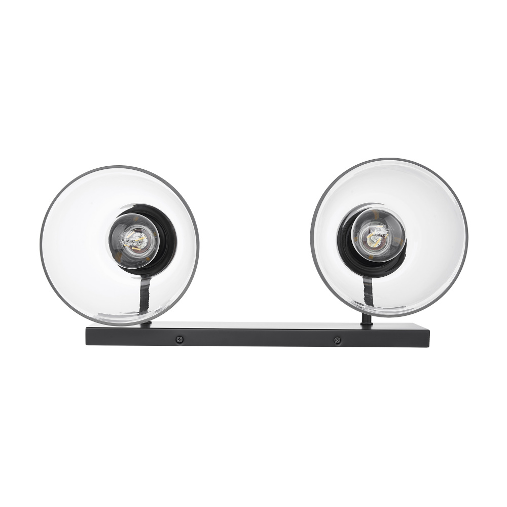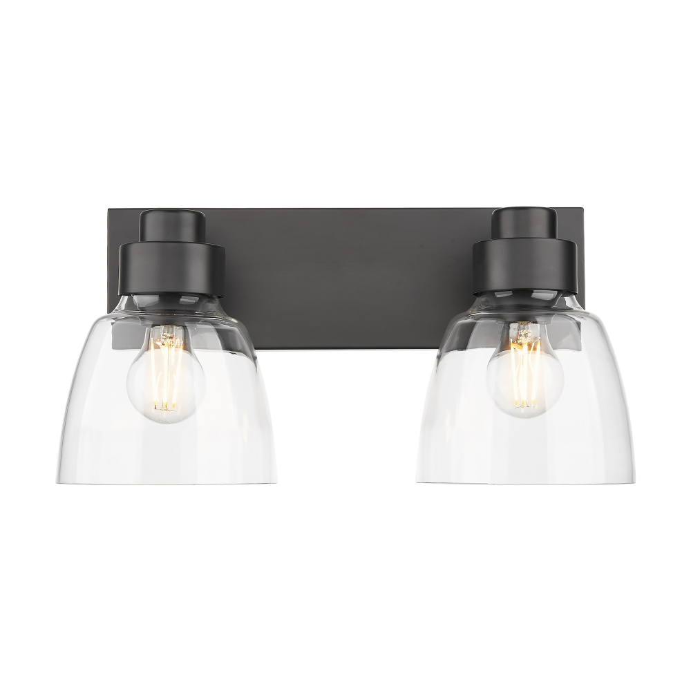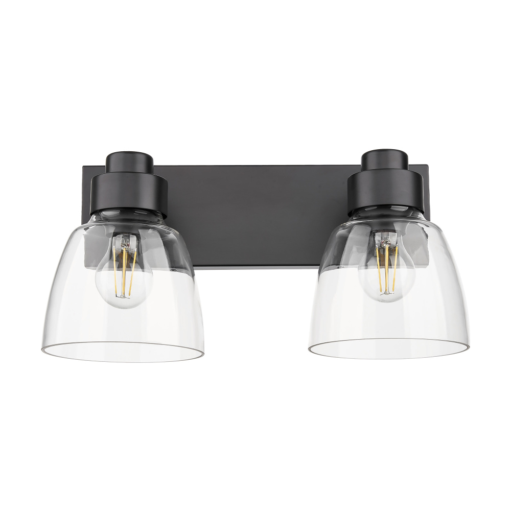 Elevate your bathroom decor with the Golden Lighting Remy 2-light Vanity in Matte Black. Featuring a glass shade and a durable Matte Black frame, this vanity light offers clean lines and a contemporary edge. The clear glass shade delivers brilliant light with a polished shine, illuminating the space while allowing the design of the bulbs to shine through. The stylish Matte Black finish is both timeless and versatile, designed to effortlessly blend with various decor styles while providing an understated elegance. Ideal for practical task illumination in bathrooms, this fixture is Damp Location Rated, making it perfect for areas with occasional moisture. Requires 2 E26 Medium base bulbs (not included), max 60 wattage per bulb. With overall dimensions of 16.88"W x 8.75"H x 8"D, it fits seamlessly into your bathroom layout. Experience functional beauty with the Golden Lighting Remy 2-light Vanity, an ideal addition to modern homes seeking stylish lighting solutions.