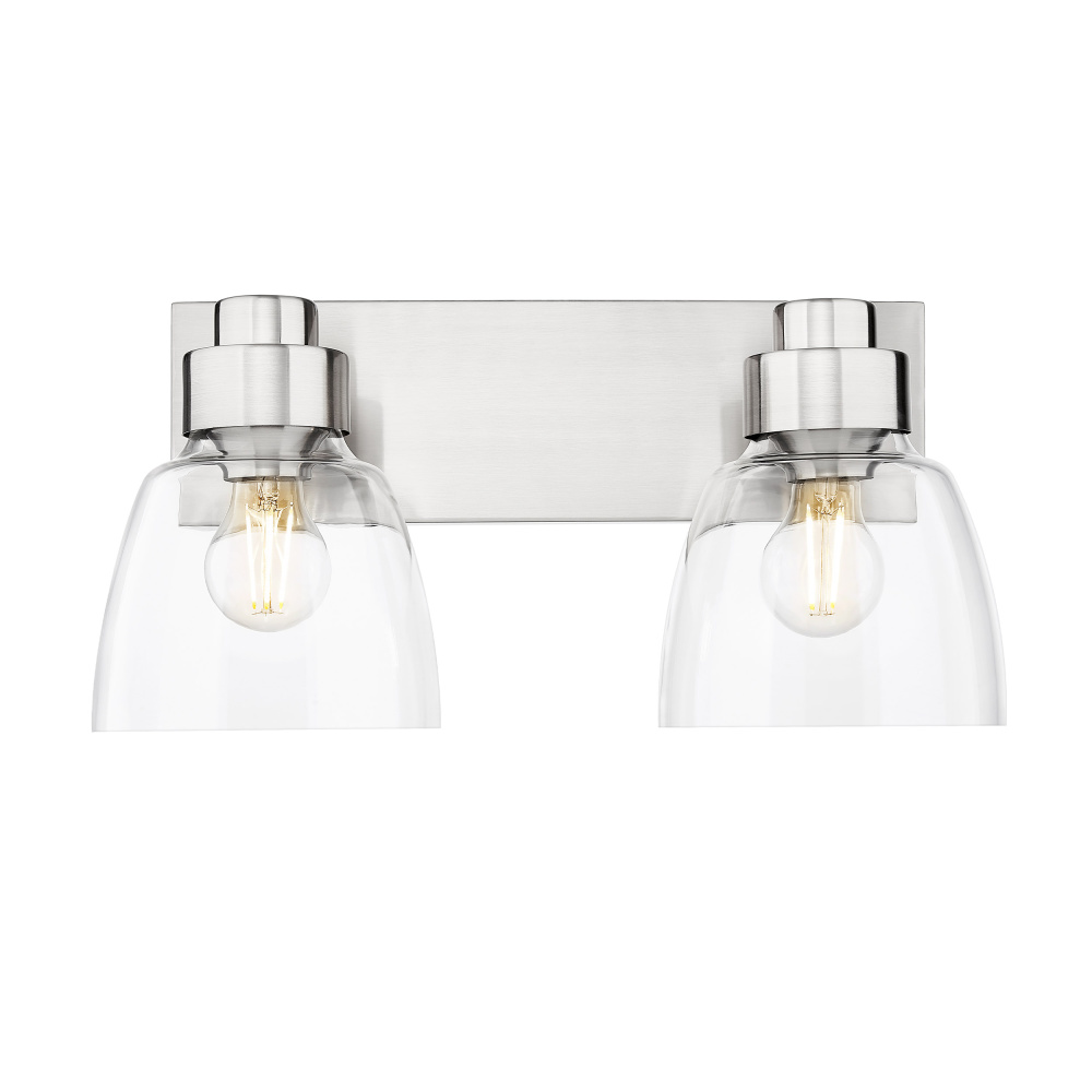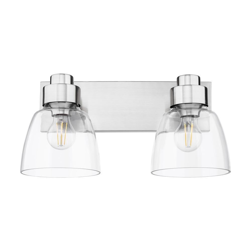 Bring modern elegance into your home with the Golden Lighting Remy 2-light Vanity in Pewter. Featuring a glass shade and a pewter frame, it creates a welcoming atmosphere. The clear glass shade allows brilliant, unobstructed light to shine through, enhancing the beauty of the bulb and fixture design. Its polished finish provides a soft and classic alternative to brighter silver tones, contributing to its timeless appeal. Its damp location rating makes it suitable for covered and semi-enclosed spaces, perfect for bathrooms, covered porches, and laundry rooms. Requires 2 E26 Medium base bulbs (not included) with a maximum wattage of 60 per bulb. Overall dimensions are 16.88"W x 8.75"H x 8"D. Elevate your space with this sophisticated fixture, offering both style and functionality.