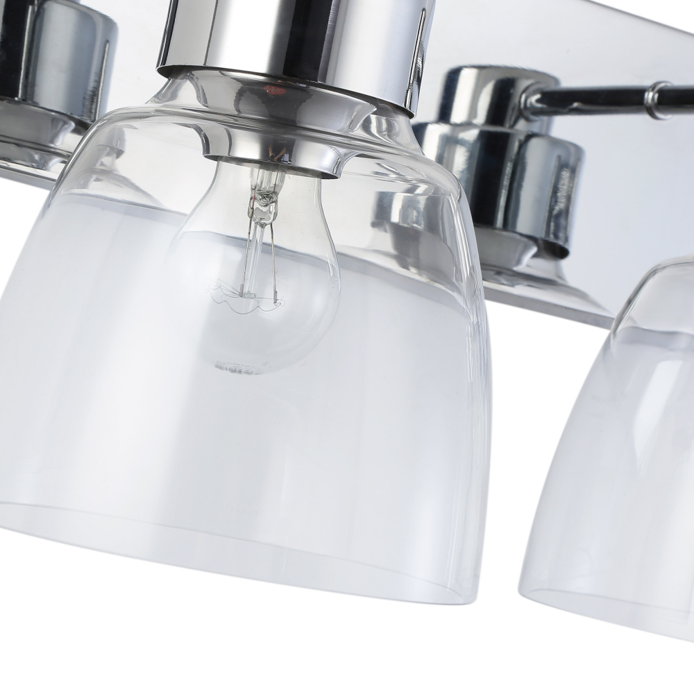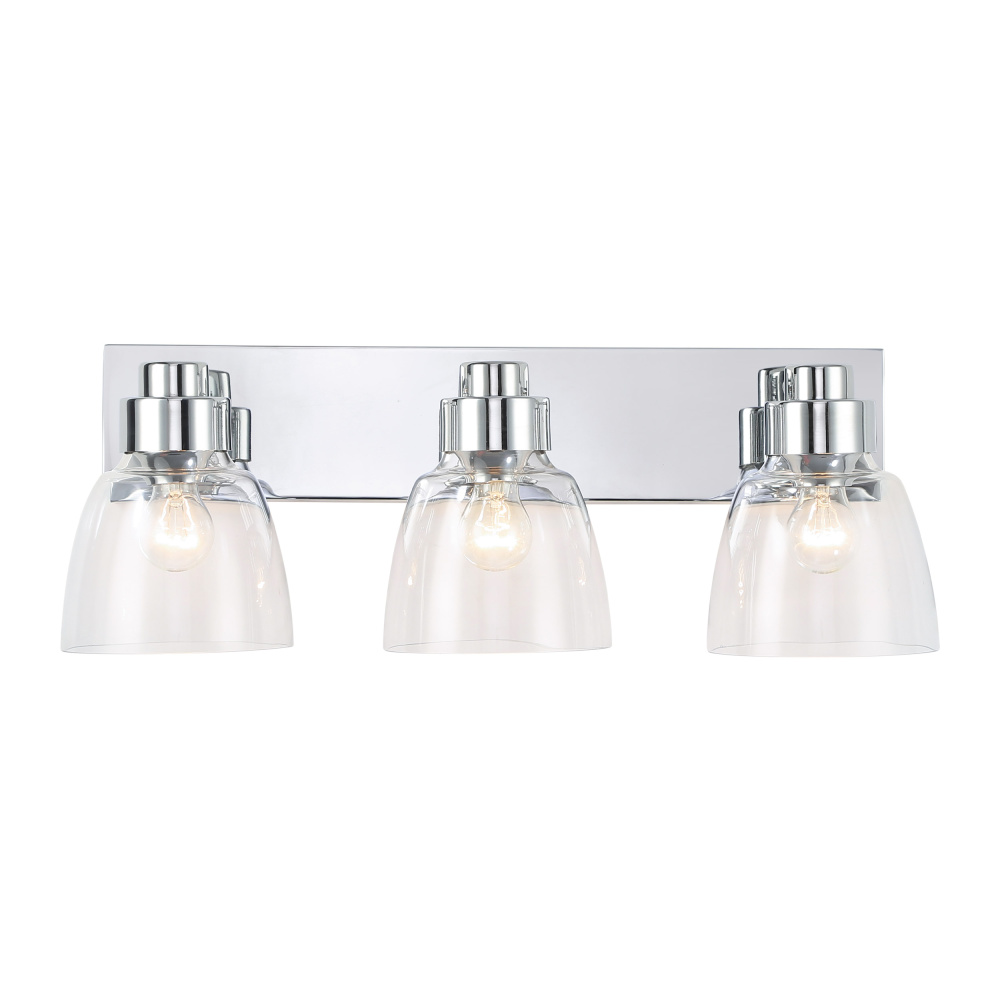 Bring timeless elegance into your home with the Golden Lighting Remy 3-light Vanity in Chrome. Featuring a glass shade and a polished chrome frame, it creates a welcoming atmosphere. The clear glass shade offers brilliant, unobstructed light, showcasing the beauty of the bulbs and the fixture's design. Its polished high-gloss finish seamlessly integrates into a wide array of decor styles, providing a sleek and sophisticated touch. This polished chrome finish adds brightness and a touch of polished perfection to your bathroom with its highly reflective, mirror-like surface. Brighten up your bathroom with dedicated lighting that flatters while providing practical task illumination. This fixture is damp location rated, making it suitable for covered and semi-enclosed spaces with occasional moisture. With overall dimensions of 24.63"W x 8.75"H x 8"D, it requires three E26 medium base bulbs (not included), with a maximum of 60 watts per bulb. Enhance your space with quality and style that is both practical and pleasing.