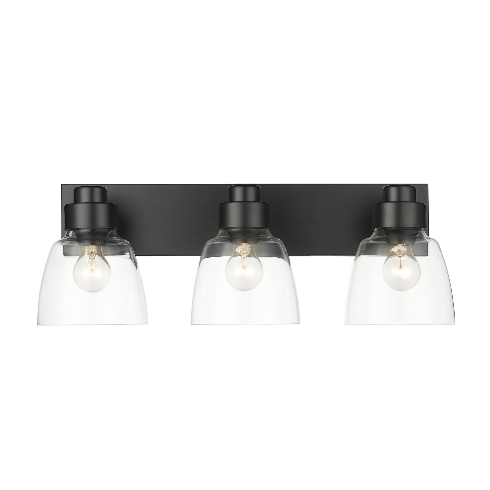 Bring sleek sophistication into your home with the Golden Lighting Remy 3-light Vanity in Matte Black. Featuring a glass shade and a matte black frame, it creates a welcoming atmosphere. The clear glass shade enhances the light quality, allowing for brilliant, unobstructed illumination. With its deep, non-reflective black surface, the matte black finish adds an understated elegance, ideal for both minimalist and bold designs. This fixture is rated for damp locations, making it suitable for bathrooms, covered porches, and laundry rooms. Requires 3 E26 Medium base bulbs (not included) with a maximum wattage of 60 per bulb. Overall dimensions are 24.63"W x 8.75"H x 8"D. Transform your space with this stylish and functional fixture—perfect for achieving a modern look with lasting appeal.