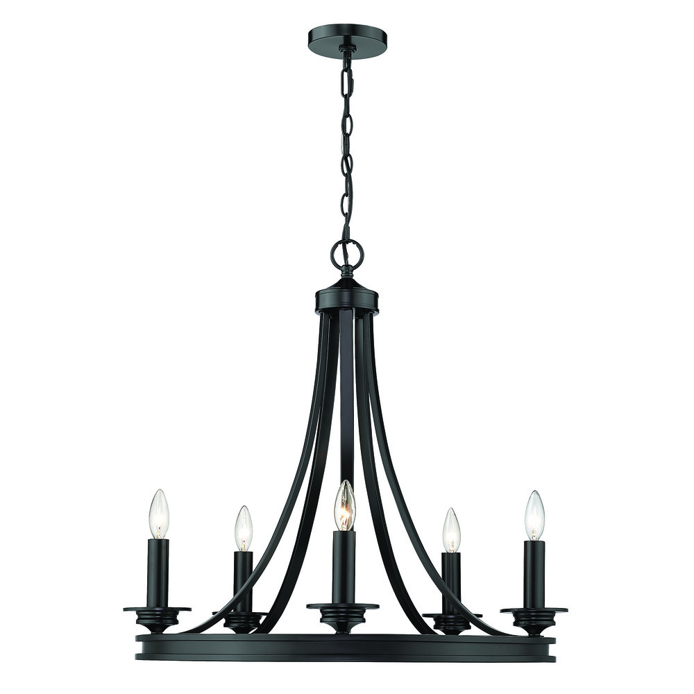 Bring modern elegance into your home with the Golden Lighting Saldano 5-light Chandelier. This fixture creates a welcoming atmosphere with its sleek design and clean lines. The Mat Black finish offers a smooth, timeless aesthetic that absorbs light, providing a sophisticated look in any decor. Use this chandelier to light up your space with its impressive five candelabra-style bulbs, perfect for illuminating dining rooms or entryways. Dry Location Rated, it's ideal for indoor use, and the adjustable height feature allows for personalization to fit any ceiling. With overall dimensions of 27.5"W x 26"H x 27.5"D, it requires five E12 candelabra base bulbs (not included), with a maximum wattage of 60 per bulb. This chandelier harmonizes classic elegance with contemporary simplicity, making it a timeless addition to your home.