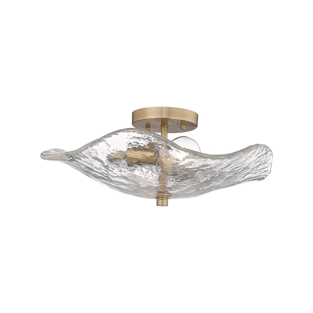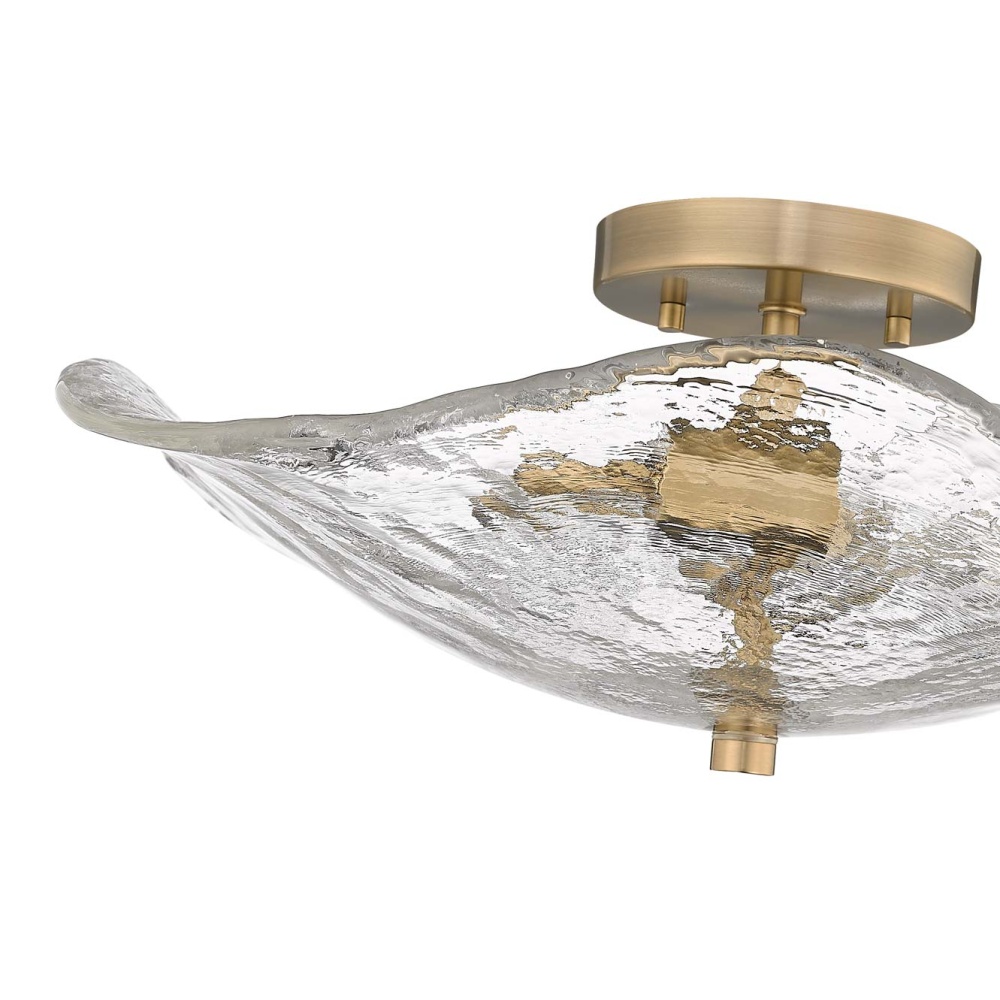 Bring nature-inspired elegance into your home with the Golden Lighting Samara 2-light Semi-Flush Mount. Featuring a glass shade and a Modern Brass frame, it creates a welcoming atmosphere. The hammered water glass shade features a heavy, irregular texture that beautifully distorts light, making it an artisanal choice for adding depth and elegance to your space. Our Modern Brass finish offers a sophisticated alternative to traditional brass, showcasing a softer hue with a rich, warm patina that enhances any decor. Perfect for entryways, bedrooms, kitchens, and living areas, this fixture is Damp Location Rated, making it suitable for spaces with occasional moisture. It requires 2 E26 Medium base bulbs (not included) with a max wattage of 60. Overall dimensions are 15.38"W x 6.63"H x 13.25"D. Illuminate your home with style and quality with this stunning piece from Golden Lighting.