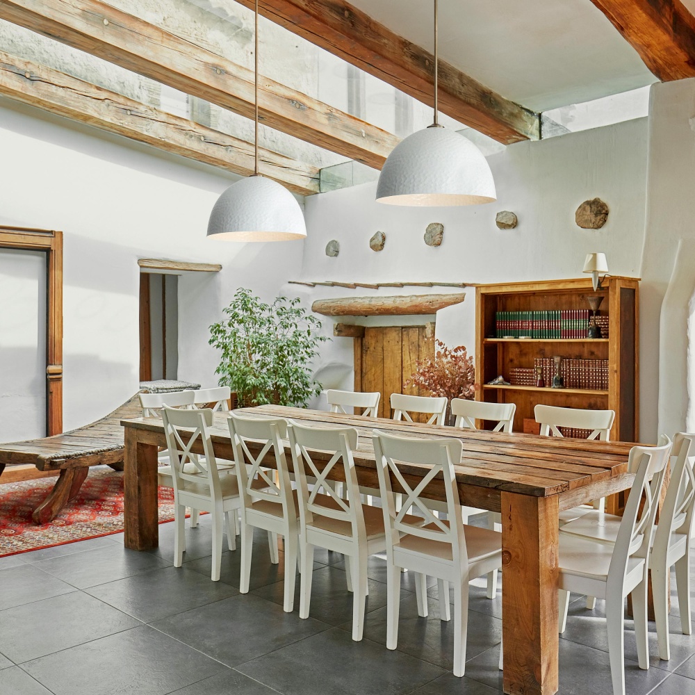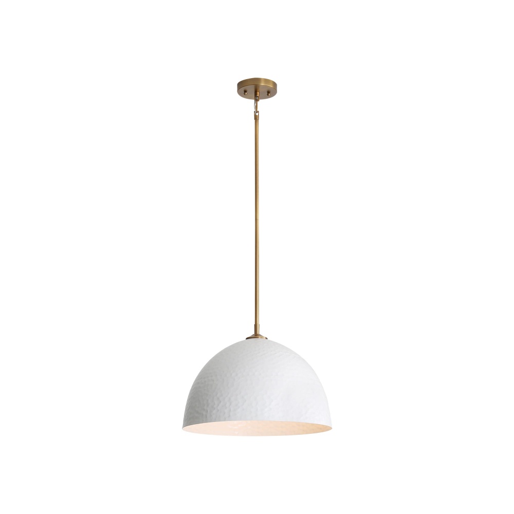 Bring rustic farmhouse elegance into your home with the Golden Lighting Shepard 1-light Pendant. Featuring a Metal shade and a Modern Brass frame, it creates a welcoming atmosphere. The Metal shade in a stunning Matte White finish emanates a clean, crisp light that complements modern minimalism. Its smooth, non-reflective surface enhances light diffusion, providing a bright and airy feel to any space. Our Modern Brass finish encompasses understated elegance, achieving a sophisticated look that integrates seamlessly with various styles. Versatile and practical, this pendant is rated for damp locations, suitable for areas like bathrooms or covered porches. Customize the hanging length between 15.875" and 57.875" for a perfect fit on sloped ceilings. Requires one E26 Medium base bulb (not included) with a maximum wattage of 100. Overall Dimensions: 16"W x 11.75"H x 16"D. Elevate your décor with quality craftsmanship and timeless design that enhances your home's character.