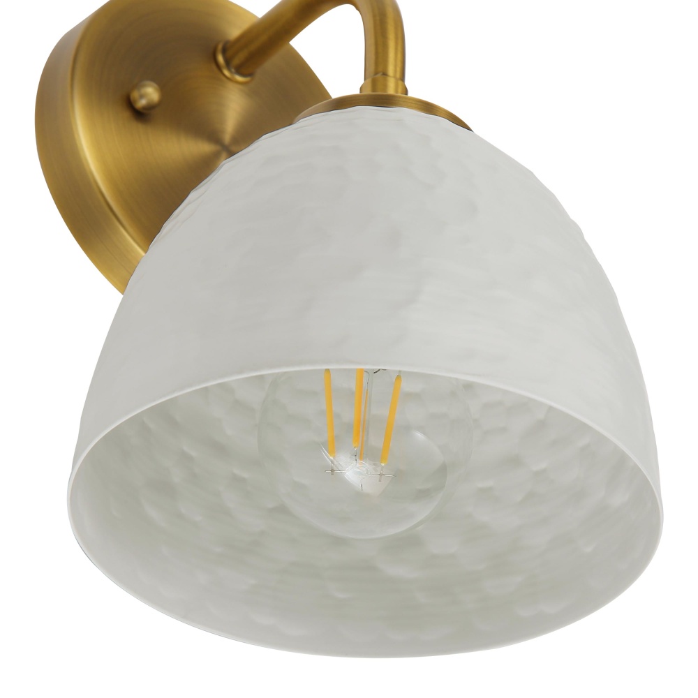 Bring traditional elegance into your home with the Golden Lighting Shepard 1-light Wall Sconce. Featuring a metal shade and a Modern Brass frame, it creates a welcoming atmosphere. The matte white metal shade offers a clean, modern look, with a smooth, non-reflective surface that beautifully absorbs light, enhancing your space without overwhelming it. Our Modern Brass finish is the epitome of understated elegance, providing a soft hue that adds classic warmth to both modern and traditional interiors. Ideal for enhancing hallways, stairways, and bathrooms, this sconce is damp location rated, making it suitable for covered and semi-enclosed spaces. With overall dimensions of 6.25"W x 9.25"H x 7.25"D, it requires one E26 medium base bulb (not included) with a maximum wattage of 100. Elevate your decor with the charming appeal of this rustic fixture, designed to bring cozy ambiance to any room.
