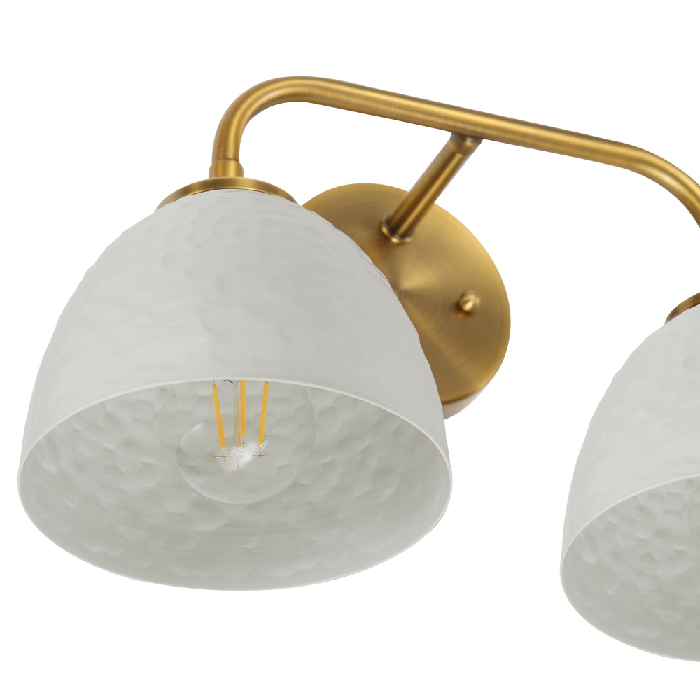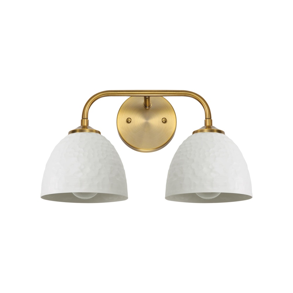 Bring farmhouse elegance into your home with the Golden Lighting Shepard 2-light Vanity in Modern Brass and Matte White shade. Featuring a Metal shade and a Modern Brass frame, it creates a welcoming atmosphere. The Metal shade is coated in a smooth Matte White finish that absorbs light effectively, enhancing its clean lines and providing a chic, modern touch to your decor. The sleek and non-reflective surface offers a contemporary appeal that fits various aesthetics. Our Modern Brass finish is the epitome of understated elegance, it moves beyond the bright yellow of traditional brass to present a softer and muted hue with a warm patina. This timeless choice adds classic warmth to both modern and traditional interiors. Designed to brighten up bathrooms, it is Damp Location Rated, suitable for covered and semi-enclosed spaces with occasional moisture. Requires 2 E26 Medium base bulbs (not included), with a maximum wattage of 100 per bulb. Dimensions: 15.5"W x 9"H x 7.25"D. Close with the charm and quality of this elegant fixture, perfect for adding a touch of warmth to your daily routine.