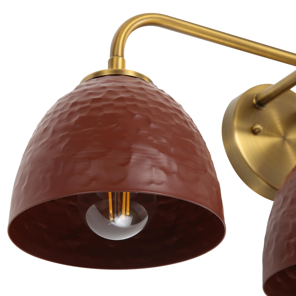 Bring farmhouse elegance into your home with the Golden Lighting Shepard 3-light Vanity. Featuring a metal shade and a modern brass frame, it creates a welcoming atmosphere. This metal shade showcases a Russet Clay finish, which boasts a rich, earthy reddish-brown color and a soft satin sheen that beautifully diffuses light, adding a bold statement to your space. The modern brass finish moves beyond the bright yellow of traditional brass, offering a muted hue with a warm patina for timeless appeal. Brighten up bathrooms with dedicated lighting that flatters while providing practical task illumination. The fixture is damp location rated, suitable for covered spaces with occasional moisture, making it ideal for bathrooms, covered porches, and laundry rooms. Overall Dimensions: 24.63"W x 9"H x 7.25"D, requires 3 E26 Medium base bulbs (not included) with a maximum wattage of 100 per bulb. Elevate your interiors with charming quality and design.