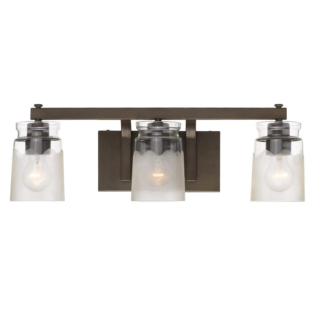 Embrace timeless elegance with the Golden Lighting Travers 3-light Vanity. Featuring a clear glass shade and a rubbed bronze frame, it creates a welcoming atmosphere perfect for your bathroom. The clear glass shade showcases a unique handcrafted design that transitions from smooth glass to a crystalline frosted texture, creating a soft, diffused glow when illuminated. Our rubbed bronze finish adds a touch of classic warmth, expertly brushed to reveal subtle highlights while providing a beautiful satin luster. Ideal for bathrooms, the damp location rating ensures it’s suitable for spaces with occasional moisture. Easy to install, it complements any decor style. Overall Dimensions: 23"W x 7.5"H x 7"D, requires 3 E26 medium base bulbs (not included), max 60-wattage per bulb. The Golden Lighting Travers Vanity light is the perfect blend of functionality and style, enhancing both the beauty and ambiance of your home.
