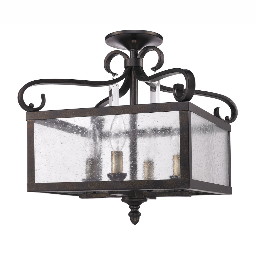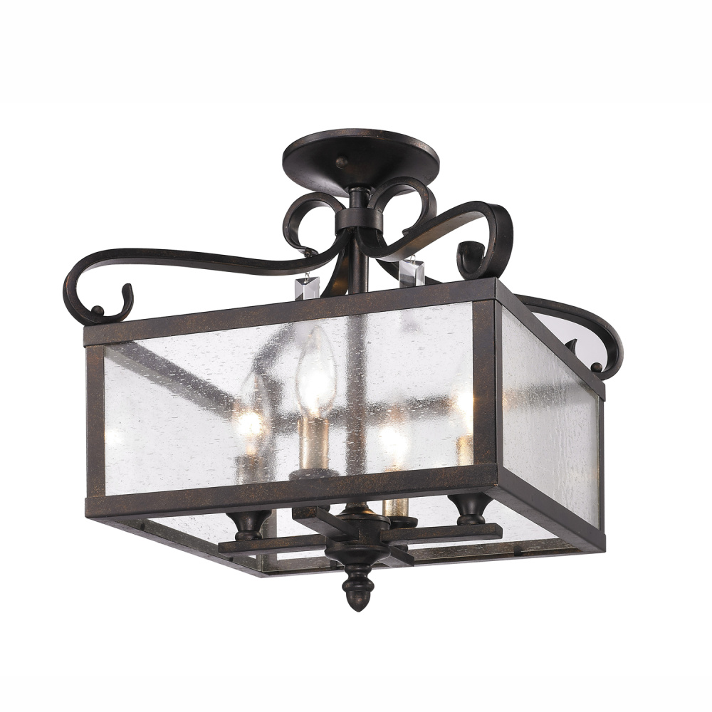Bring Traditional elegance into your home with the Golden Lighting Valencia 4-light Pendant. Featuring a glass shade and a Fired Bronze frame, it creates a warm and inviting atmosphere. The Seeded Glass shade, infused with tiny air bubbles, adds a unique texture and vintage character, delivering a brilliant sparkle when illuminated. The Fired Bronze finish boasts deep, rustic authenticity with its tactile texture and warm highlights. Perfect for indoor spaces not subject to moisture, this pendant can be installed as a semi-flush mount or pendant with adjustable height (min: 19.75"- max: 91.75"). Overall dimensions are 18.5"W x 16.75"H x 18.5"D, requiring 4 E12 Candelabra base bulbs (not included, max 60 wattage). Discover the blend of history and elegance with this beautiful lighting fixture.