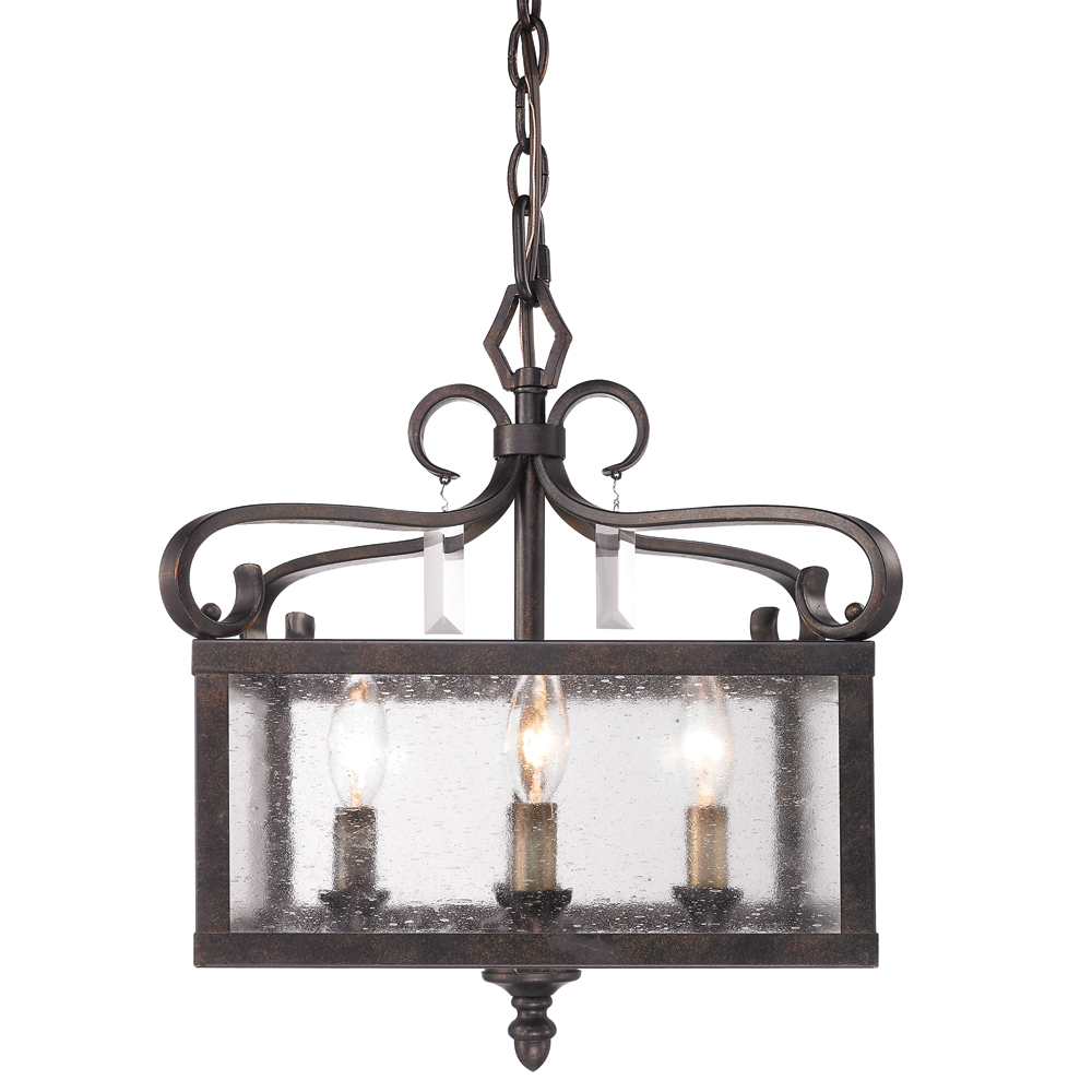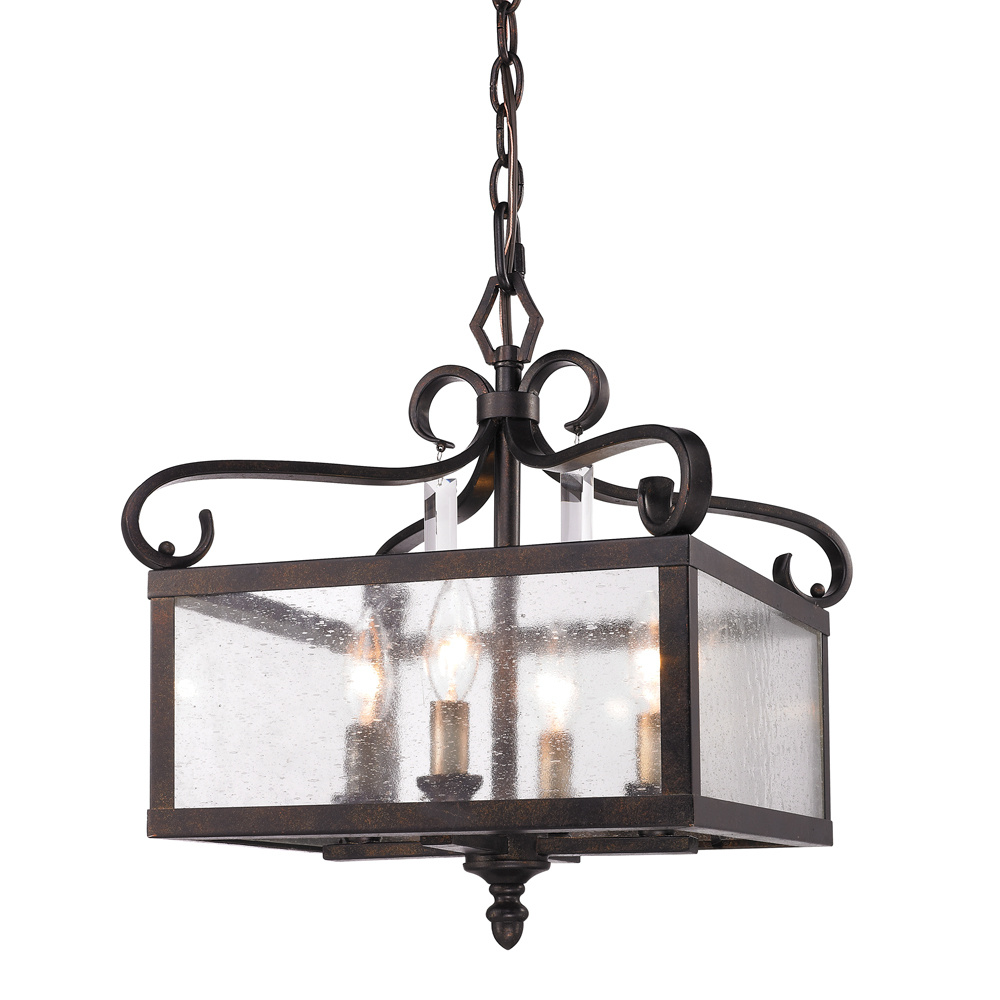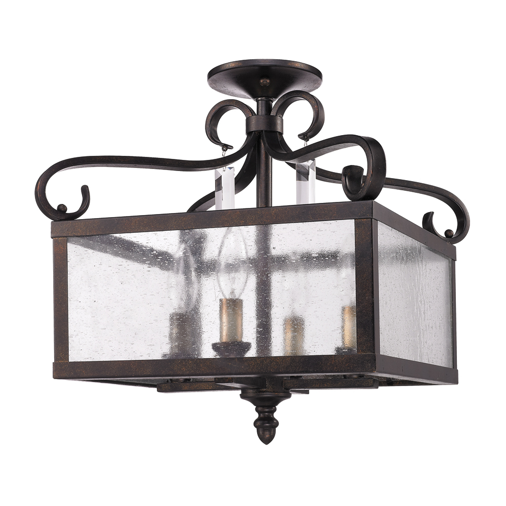 Bring traditional elegance into your home with the Golden Lighting Valencia 4-light Semi-Flush Mount. Featuring a glass shade and a Fired Bronze frame, it creates a welcoming atmosphere. The exquisite glass shade showcases seeded glass, characterized by small, infused air bubbles that add a vintage texture, catching the light beautifully. Crafted with a rich Fired Bronze finish, this fixture brings rustic authenticity and a sense of history to any room. Ideal for entryways, bedrooms, kitchens, and living areas, it is dry location rated for indoor spaces not subject to moisture. It features a convertible design with adjustable height, making it suitable for sloped or flat ceilings. Overall Dimensions: 13.5"W x 15.5"H x 13.5"D. Requires 4 E12 Candelabra base bulbs (not included), max 60 wattage per bulb. Elevate your space with this quality fixture that embodies both style and functionality.
