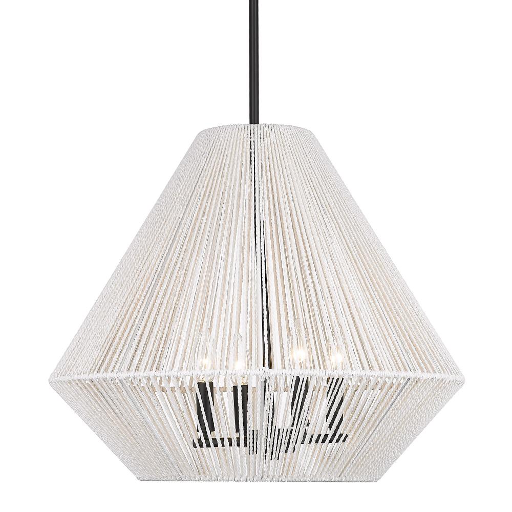 Bring free-spirited elegance into your home with the Golden Lighting Valentina 4-light Pendant. Featuring a rope shade and a matte black frame, it creates a welcoming atmosphere. The handcrafted rope shade brings a textured, organic feel to your space, akin to sun-bleached rope found on a tropical beach. Clean, bright, and textural, the bleached white raphia rope enhances your decor with a coastal vibe. The matte black finish, known for its timeless versatility, absorbs light and creates a sophisticated look that complements various styles from minimalist to bold. Ideal for indoor spaces not subject to moisture, this pendant is sloped-ceiling compatible and features an adjustable height from 22.375" to 64.375", making it perfect for dining rooms and kitchens. Overall dimensions: 21"W x 17.75"H x 21"D. Requires 4 E12 candelabra base bulbs (not included), with a maximum wattage of 60 per bulb. Elevate your space with this stylish fixture, where quality meets artistic charm.