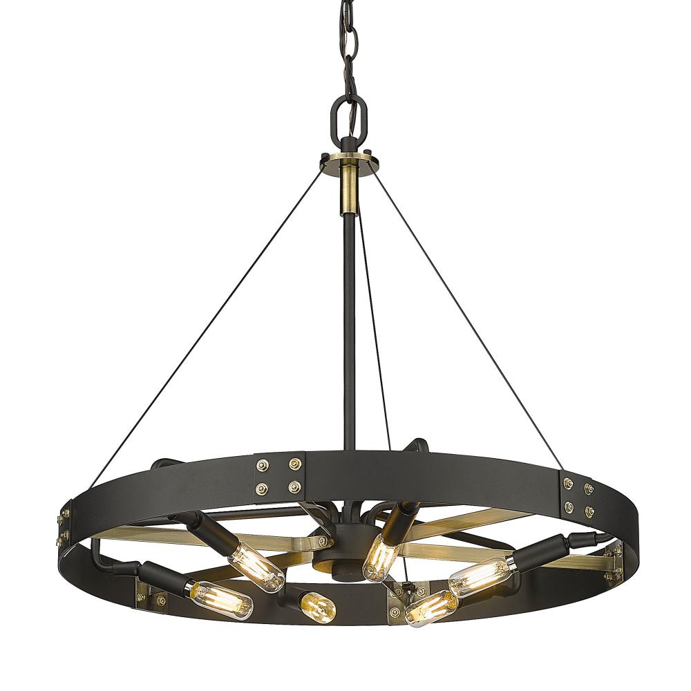 Bring industrial elegance into your home with the Golden Lighting Vaughn 6-light Pendant. This striking fixture creates a welcoming atmosphere with its utilitarian design and mechanical aesthetic. The Natural Black finish offers a softer, matte surface that beautifully contrasts with aged brass accents, celebrating the rugged beauty of early 20th-century machinery. Illuminating your space, this pendant is perfect for focused light in kitchens, dining rooms, and entryways, ideal for both decorative and functional purposes. Rated for Dry Locations, it fits seamlessly into any indoor setting and offers adjustable height from 20" to 92". With overall dimensions of 22.5"W x 19.25"H x 22.5"D, it requires six E12 candelabra base bulbs (not included), with each bulb having a maximum wattage of 60. Embrace the vintage industrial character it brings to your home with its bold form and design.