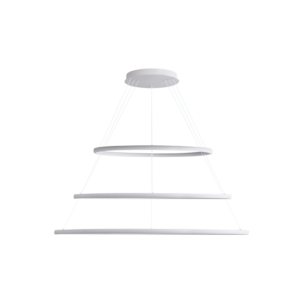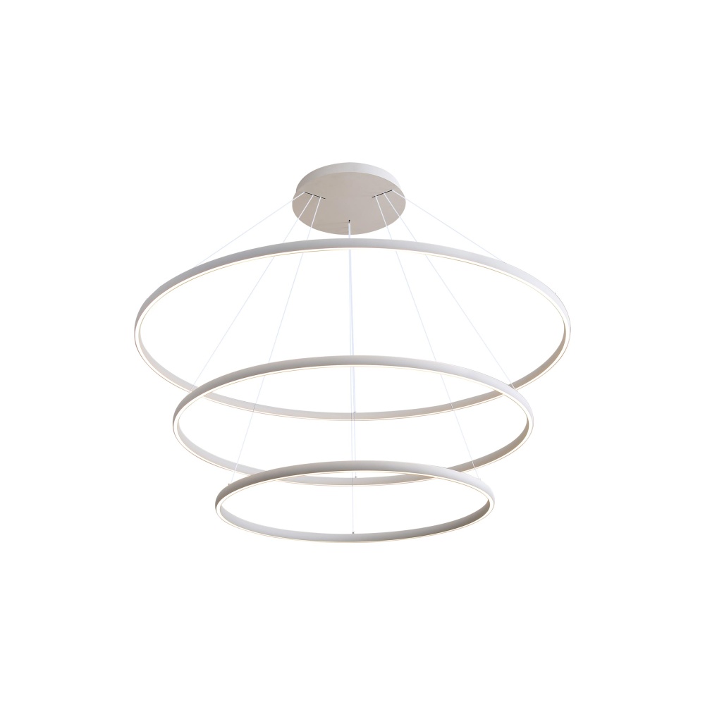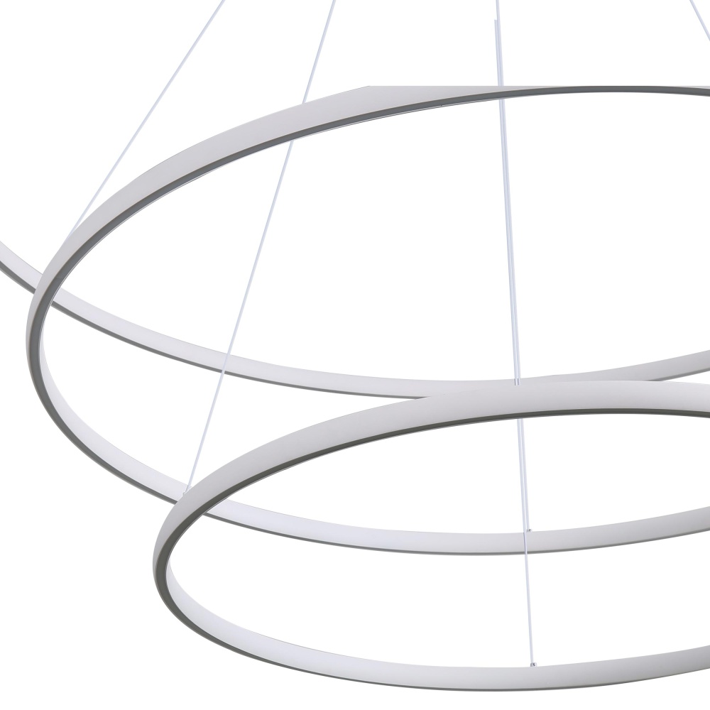 Bring modern elegance into your home with the Golden Lighting Veritas Integrated LED 59in 3-tier Chandelier. Featuring a sleek design and a Sand White finish, it creates a welcoming atmosphere. The minimalist structure showcases a unique geometric form and does not include a shade, allowing the integrated LED technology to illuminate your space brilliantly. The Sand White finish, with its non-reflective matte surface and sandy texture, absorbs light beautifully to enhance the ambiance. Ideal for indoor spaces not subject to moisture, such as dining rooms and foyers, this chandelier is compatible with sloped ceilings and features adjustable hanging lengths from 30" to 123". Overall dimensions are 59"W x 1.13"H x 59"D, and the chandelier boasts energy-efficient integrated LED technology, providing 15500 rated lumens at a warm 3000K CCT. Close your space with a statement piece that embodies quality and modern aesthetics.