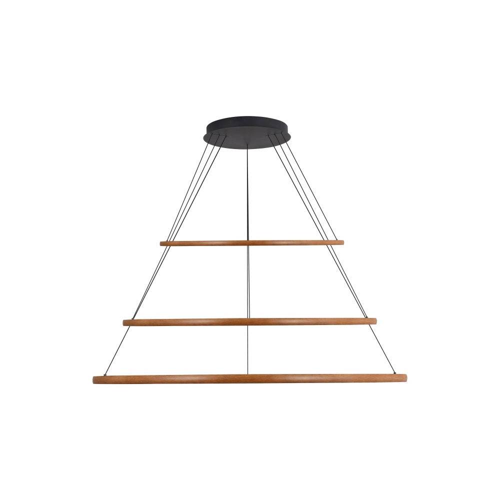 Bring modern elegance into your home with the Golden Lighting Veritas Integrated LED 59in 3-tier Chandelier. Featuring a sleek design and a Walnut finish, it creates a welcoming atmosphere. The minimalist structure showcases a unique geometric form and does not include a shade, allowing the integrated LED technology to illuminate your space brilliantly. The Walnut finish captures the warmth of wood with a satin luster, adding a rich, organic touch to contemporary designs. Ideal for indoor spaces not subject to moisture, such as dining rooms and foyers, this chandelier is compatible with sloped ceilings and features adjustable hanging lengths from 30" to 123". Overall dimensions are 59"W x 1.13"H x 59"D, and the chandelier boasts energy-efficient integrated LED technology, providing 15500 rated lumens at a warm 3000K CCT. Close your space with a statement piece that embodies quality and modern aesthetics.