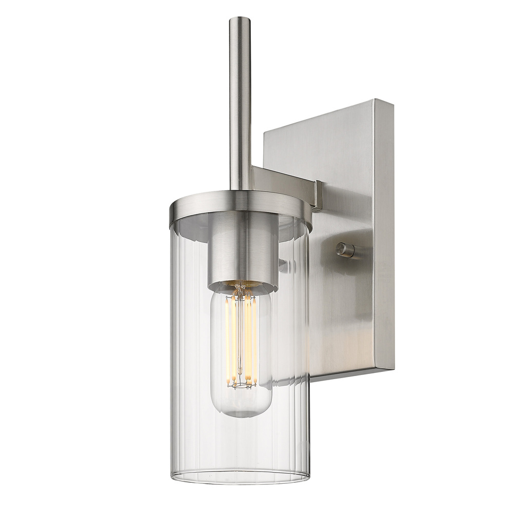 Bring timeless sophistication into your home with the Golden Lighting Winslett 1-light Wall Sconce in Pewter. Featuring a glass shade and a Pewter finish frame, it creates a welcoming atmosphere. This clear ribbed glass shade is distinguished by fine vertical ribs that refract light beautifully, adding depth and texture to your space. The Pewter finish offers a soft grey hue with satin lustre, gracefully diffusing light for an elegant glow. Ideal for hallways, stairways, and bathrooms — or enhancing the ambiance in bedrooms and dining rooms, this sconce is Damp Location Rated for areas with occasional moisture. Overall Dimensions: 4.75"W x 13.5"H x 5.75"D and requires 1 E26 Medium base bulb (not included), max 60 wattage per bulb. Elevate your decor with the stylish and versatile appeal of Golden Lighting.