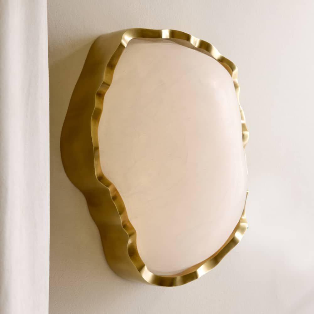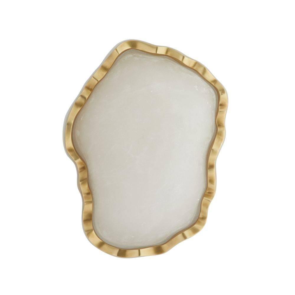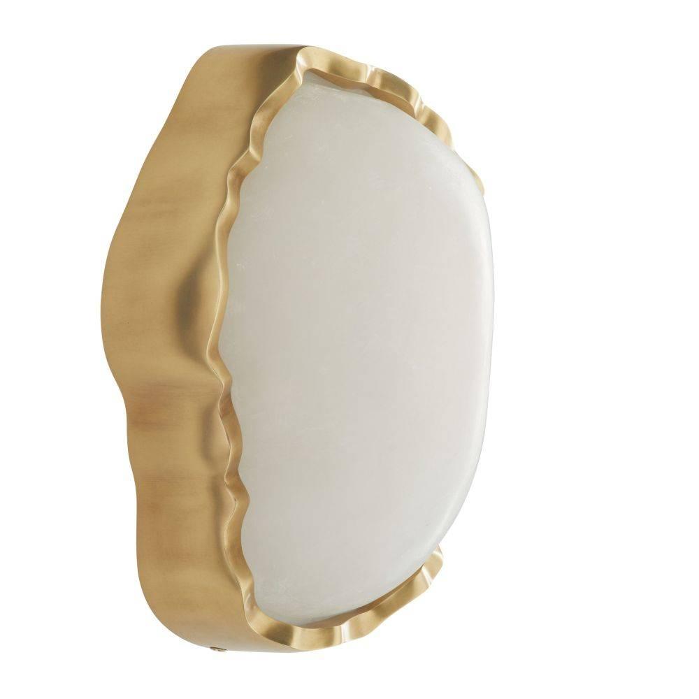 Like a shaped and polished cabochon, a freeform fixture of white alabaster is clasped in a setting of antique brass. Recalling a precious gem, this integrated LED fixture makes a stylish accent when paired or installed in multiples along a hallway. Damp-rated, although limited covered outdoor areas may affect finish. Finish will vary.