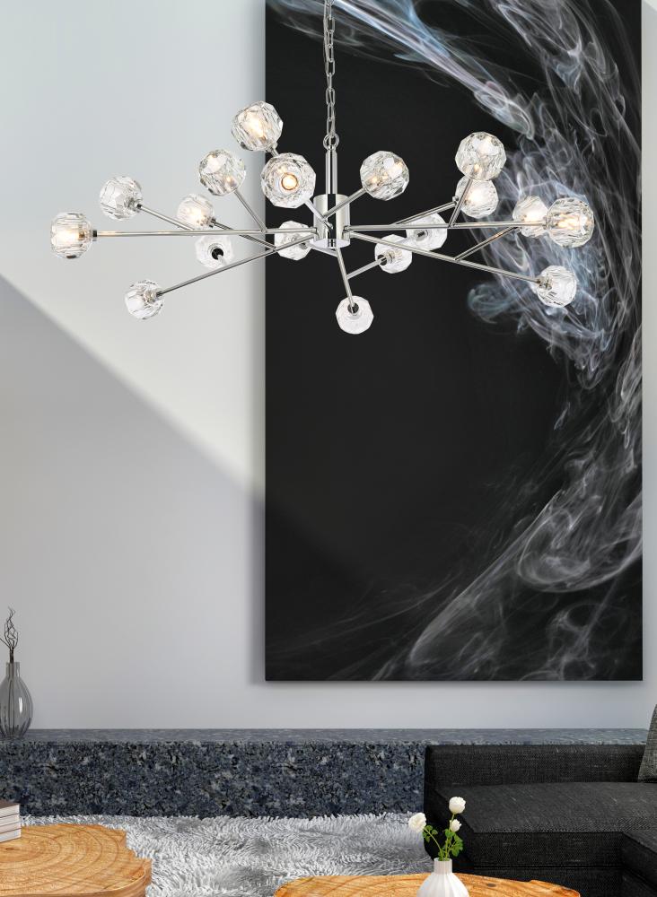 Crafted from iron metal and crystal, it features a round ceiling canopy, a 60 inch hanging chain, and arms extended with a solid K9 crystal ball from rods at all angles for a modern and linear look. Each 20W G9 bulb ( not included) is diffused by a faceted clear crystal ball giving the fixture a touch of industrial and glam inspiration. This work of art will add an artful focal point to your entryway, dining room, kitchen, or office. Evoking a sophisticated and timeless aesthetic to any space and will be an instant conversation started with its finely faceted crystal sphere which is polished by hand to reflect and refract light. Available in three different finishes in gold, chrome, and black.