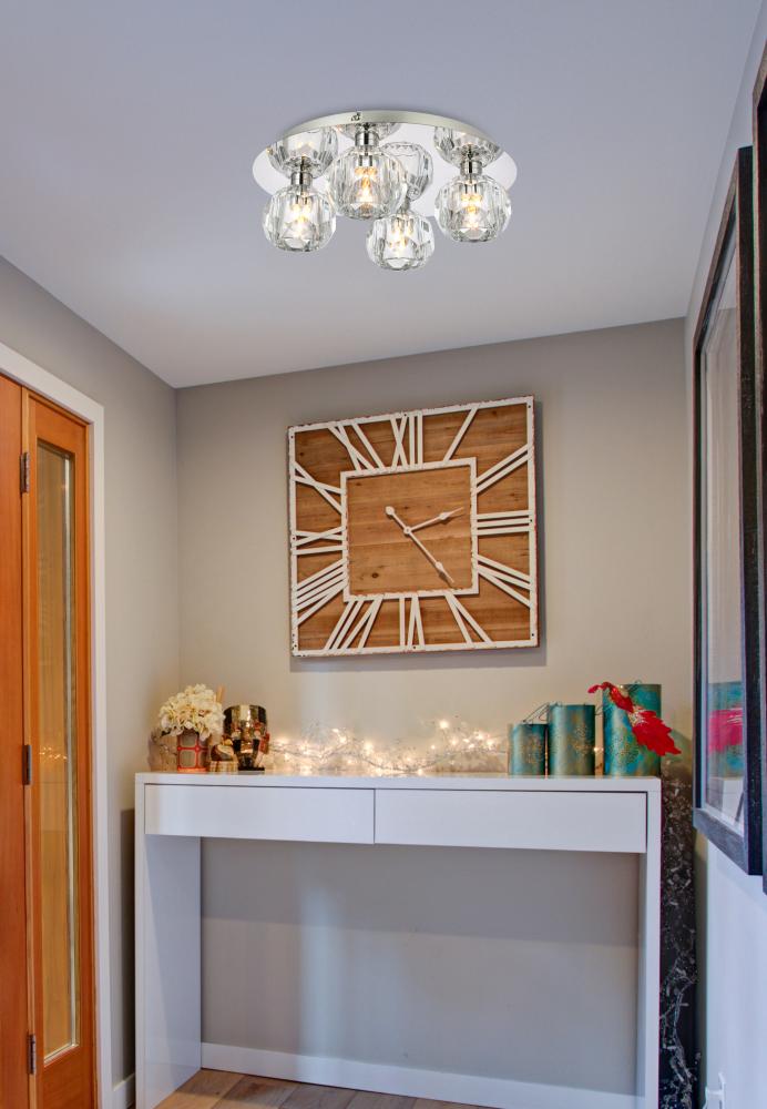 Hexagonal and pentagonal facets on the 4 inch crystal spheres tastefully diffuses the soft illumination from each arm