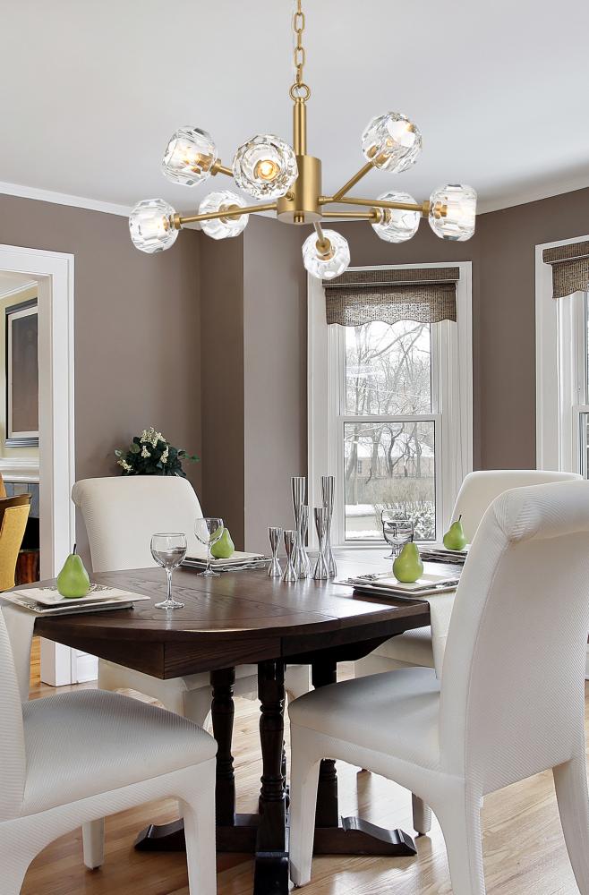 Crafted from iron metal and crystal, it features a round ceiling canopy, a 60 inch hanging chain, and arms extended with a solid K9 crystal ball from rods at all angles for a modern and linear look. Each 20W G9 bulb ( not included) is diffused by a faceted clear crystal ball giving the fixture a touch of industrial and glam inspiration. This work of art will add an artful focal point to your entryway, dining room, kitchen, or office. Evoking a sophisticated and timeless aesthetic to any space and will be an instant conversation started with its finely faceted crystal sphere which is polished by hand to reflect and refract light. Available in three different finishes in gold, chrome, and black.
