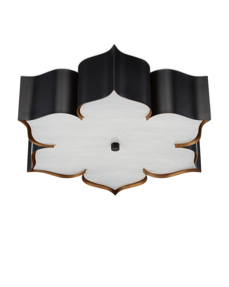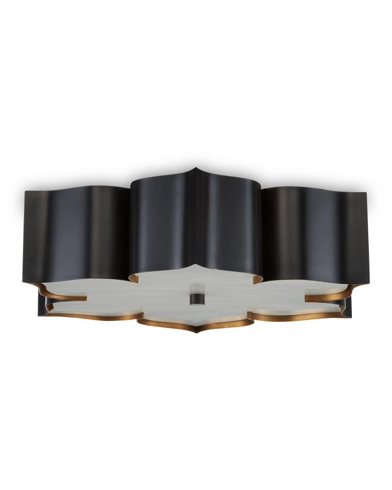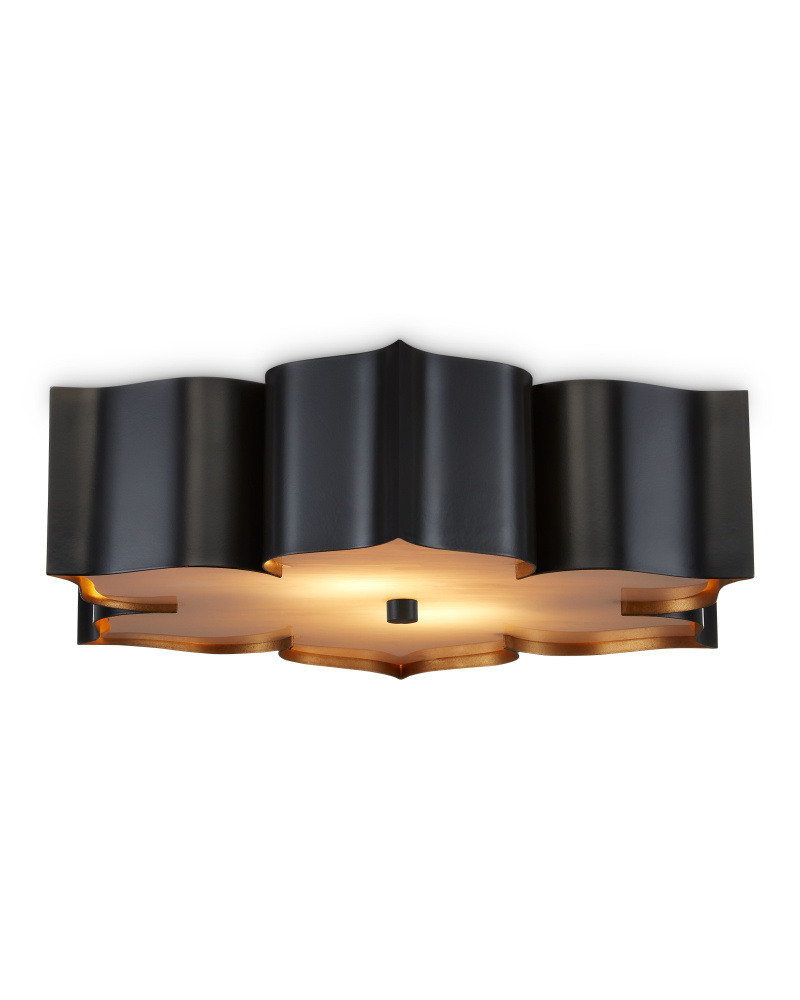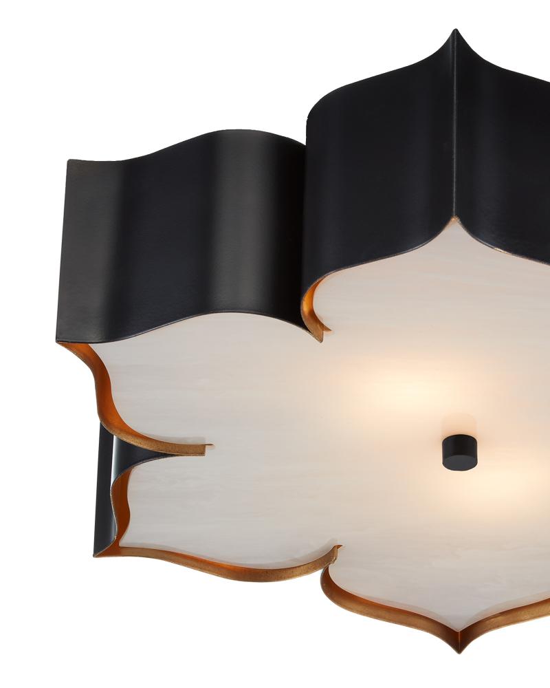 The Grand Lotus Black Flush Mount receives its good looks from a combination of stunning workmanship and a mix of satin black and contemporary gold leaf finishes. The black chandelier is skillfully fashioned from wrought iron.
