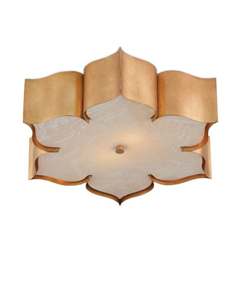 Undulations of luxurious amber-hued metal treated to an antique gold leaf finish form the flowering silhouette of the Grand Lotus Flush Mount, one of our bestselling light fixtures. Skillfully fashioned from wrought iron, this two-light fixture with its marbleized acrylic diffuser is a gorgeous interpretation of the blossom upon which Asian deities are known to pose. Measuring 19 inches in diameter, this is one of several designs in the Grand Lotus collection.