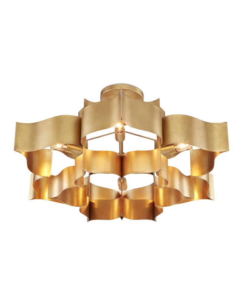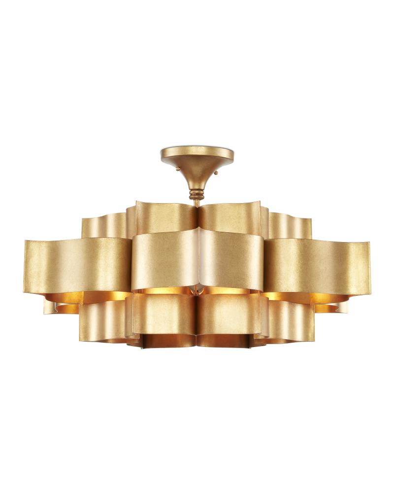 The gold version of the Grand Lotus Chandelier receives its majestic good looks from a combination of stunning workmanship and an antique gold leaf finish. Skillfully fashioned from wrought iron, the fixture is a gorgeous interpretation of the blossom upon which Asian deities are known to pose. The six-light chandelier measures 30 inches in diameter and is adjustable in height. We also offer this fixture, which is one of several fixtures in the Grand Lotus collection, in a contemporary silver leaf finish.