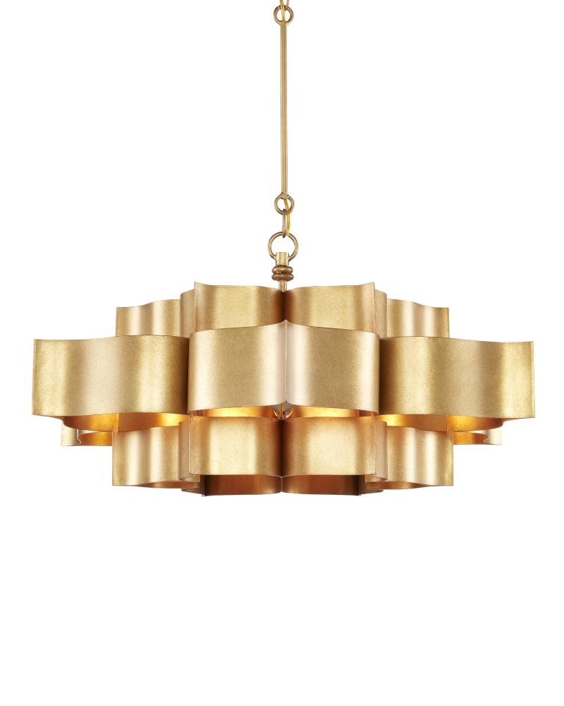 The Grand Lotus Gold Large Chandelier receives its majestic good looks from a combination of stunning workmanship and its antique gold leaf finish. The gold chandelier is skillfully fashioned from sheets of wrought iron. This is one of a number of designs in a variety of finishes in this family of fixtures. Adjustable from 16" to 100" with use of included chain/rod kit/cable. If your space calls for a longer drop, additional chain/rods/cable is available for purchase.